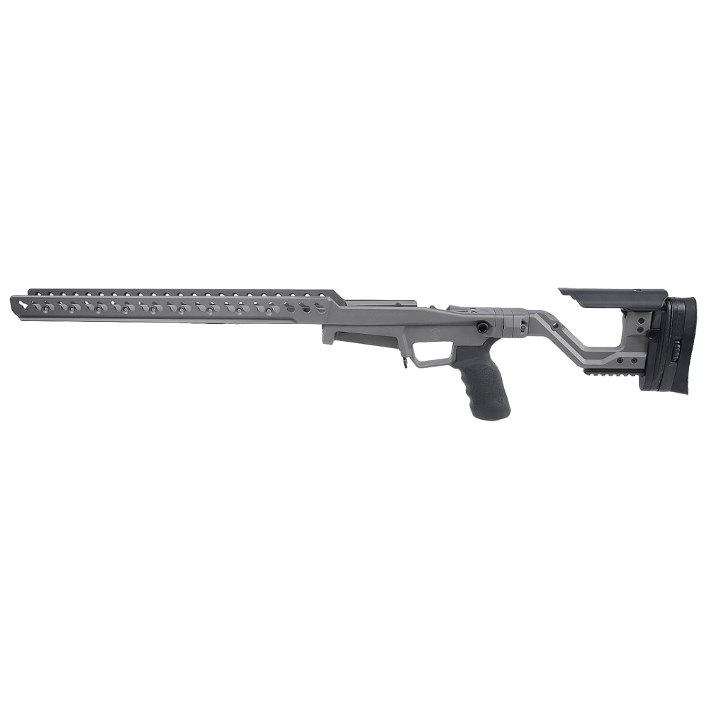 The Accuracy International AT-X Chassis is designed specifically for professional competition shooters, embodying the renowned quality and precision associated with Accuracy International. Adapted from the acclaimed AT-X Rifle, the Accuracy International AT-X Chassis features a fixed stock that can be finely adjusted for the user's preferred length of pull, cheek height, and recoil-pad height/cant through the use of corresponding knobs. The fore-end of the AT-X Chassis is equipped with KeySlot mounting points at the 3, 6, and 9 o'clock positions, running the entire length to accommodate various accessories such as weights, fore-end bridges, sling swivels, bipod mounts, and rails. An integrated ARCA rail on the fore-end bottom allows for easy installation and adjustment of a compatible bipod or tripod. The magazine well is overcut to facilitate quick magazine changes, and an integrated barricade stop enhances stability during unconventional shooting positions. the AT-X Chassis is tailored to meet the precise needs of professional competition shooters.