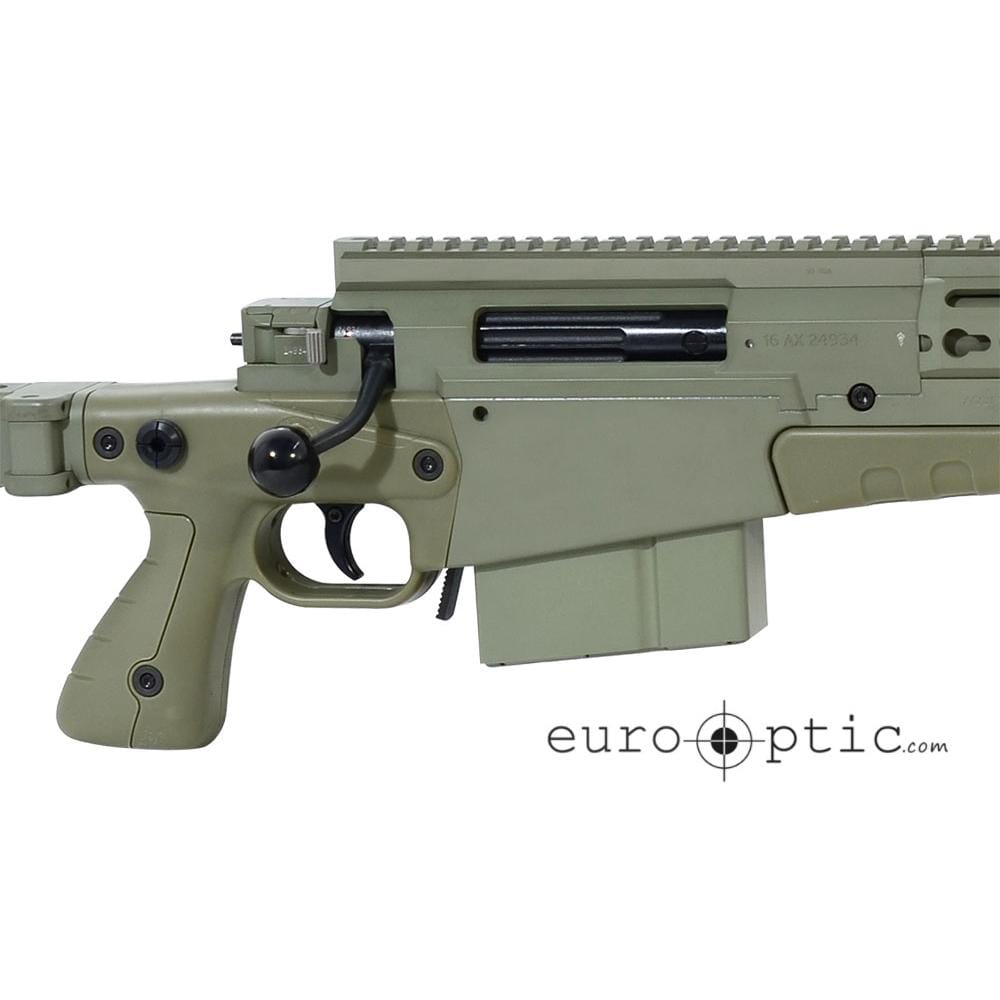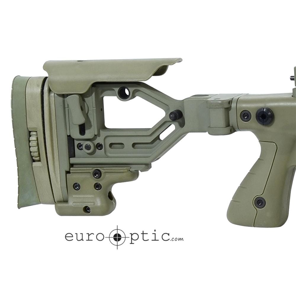 Full-length NATO STANAG 4694/Mil Std 1913 rail for accessories, optics, night vision equipment, and more. Aerospace-grade aluminum with corrosion-resistant protective coating. Rail is inclined 20MOA for .308 Win and 30MOA for magnum calibers.While the top foreend rail is full-length (and matched to the angle of the action rail), the foreend of the AX is an octagonal tube featuring AI's patented KeySlot mounting system. This foreend is easily removed with the 4mm hex wrench stored in the cheekpiece.QD flush cup sling attachments are located on the main chassis and removable/repositionable attachment points are located on rail sections attached to foreend.QuickLoc barrel release system allows for barrel removal and refit in under one minute using only the 4mm hex wrench included in cheekpiece.Chassis folding stock reduces overall rifle length by 260mm (~10").Cheekpiece is configurable for lateral and height adjustments, and also stores a 4mm hex wrench for rifle disassembly.Butt pad features a friction-locking mechanism for easy, tool-less height and angle adjustment. Rifle length of pull can be adjusted by 40mm without tools or accessories, and even more with the addition of optional 10mm or 20mm spacers (not included)Pistol grip is replaceable in minutes and can utilize different backstraps.3-position safety is based on the design of the Accuracy International Arctic Warfare (AW) battle-proven system.Two-stage trigger with adjustable shoeIncludes 10-round low-friction magazineSpecifications: