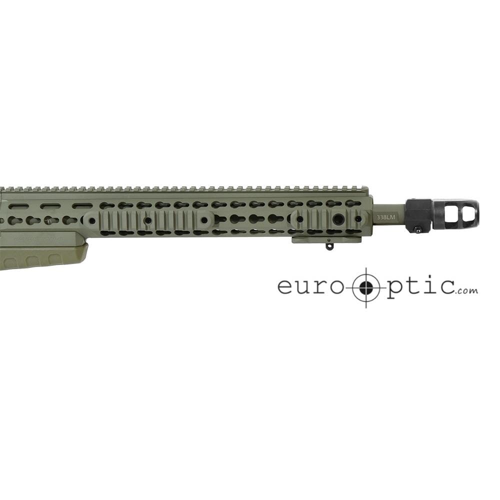This particular Accuracy International AXMC is a .338 Lapua Magnum with a 20" threaded barrel with muzzle break that features a green stock.