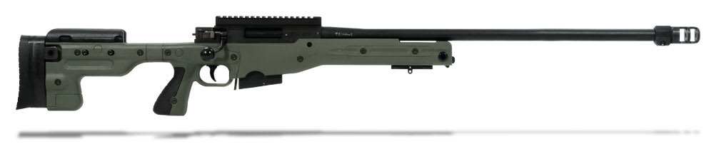 This green Accuracy International AT .308 Winchester rifle has a fixed stock, 26" threaded barrel, adjustable cheekpiece, sling points, pistol grip, 3 position safety, two-stage trigger, flat-bottomed action, 20mm diameter close fitting bolt with six locking lugs, one-piece extractor, corrosion resistant magazine, and muzzle brake.