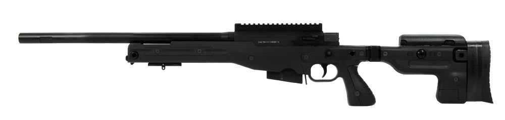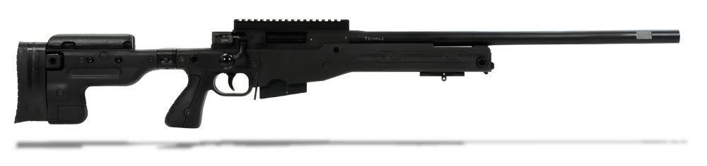 This black Accuracy International AT .308 Winchester rifle has a folding stock, 20" non-threaded barrel,adjustable cheekpiece, sling points, pistol grip, 3 position safety, two-stage trigger, flat-bottomed action, 20mm diameter close fitting bolt with six locking lugs, one-piece extractor, and corrosion resistant magazine.