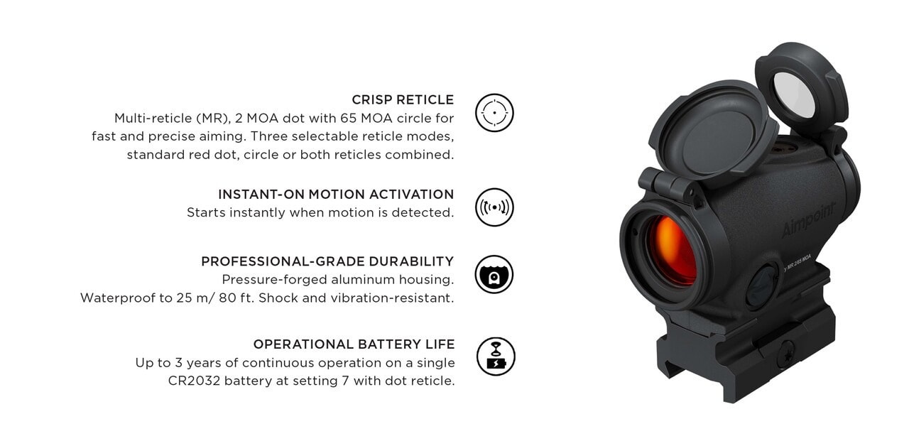 Built to withstand the harshest environments, the Aimpoint Duty RDS MR boasts a pressure-forged aluminum housing that is waterproof up to 25 meters (80 feet) and highly resistant to shock, vibration, and extreme temperatures. Its motion-sensing “instant-on” activation ensures the sight is ready the moment it’s moved, while a side-loading CR2032 battery powers the optic for up to 3 years (30,000 hours) of continuous use.