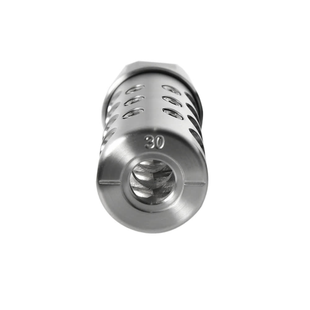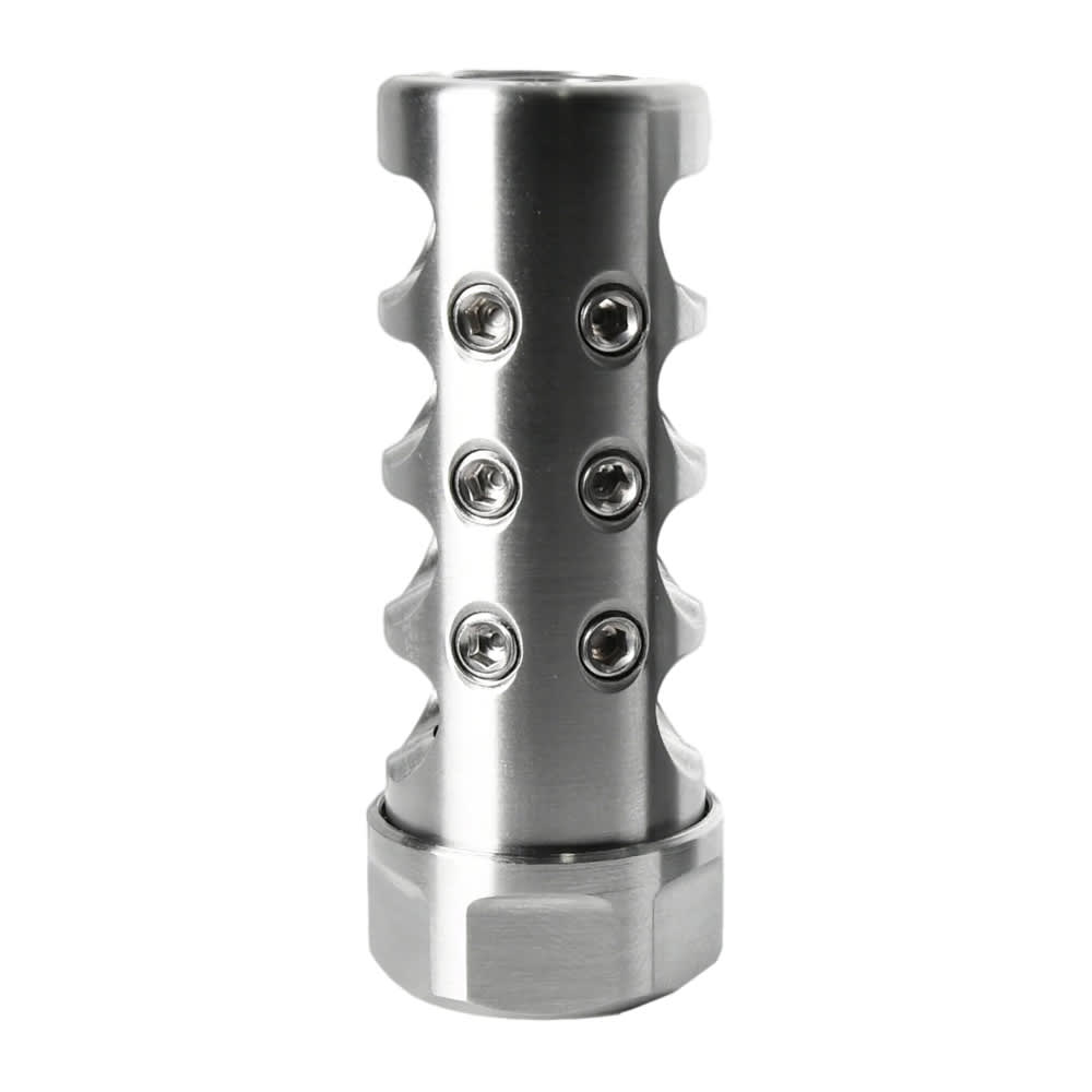 The American Precision Arms Gen 4 Micro Bastard is a self-timing muzzle brake designed for light sporter-weight barrels in .22 caliber, threaded 5/8x24, and finished in a polished stainless steel. The Gen 4 features newly optimized tunable top ports for maximum efficacy and adjustability, along with a redesigned port layout and internal manifold that is more efficient and softer sounding than previous generations. APA's proprietary U.R.P. (Universally Removable Plug) calibrated top port system allows the shooter to fine-tune muzzle rise and recoil impulse without the need for thread-tite, and a caliber and level line is machined directly onto the brake face for easy, precise installation. The Micro Bastard is sized for barrels ranging from .600" to .850" in diameter, making it ideal for heavy sporter to sporter-weight profiles. Completely CNC machined at APA's facility in Jefferson, Georgia, the Gen 4 Micro Bastard delivers pound-for-pound class-leading recoil reduction in an ultra-lightweight package.