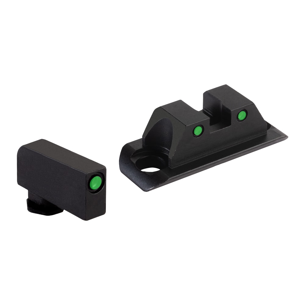 The AmeriGlo Green Tritium 3-Dot Sight Set is a high-visibility, optic-compatible iron sight system designed specifically for Glock Gen 5 (and compatible) 9mm and .40 caliber pistols. As part of the A-CUT/COA series, this set is engineered with a .240" tall front sight to provide a reliable co-witness through the window of slide-mounted red dot optics. Unlike the AC-809, this version features a full 3-dot tritium configuration, meaning both the front and rear sights contain self-luminous green tritium lamps for target acquisition in total darkness. To maintain a clear sight picture when using an electronic dot, all three tritium lamps are surrounded by black outlines, which prevents the white rings typical of standard night sights from distracting the shooter's eye.