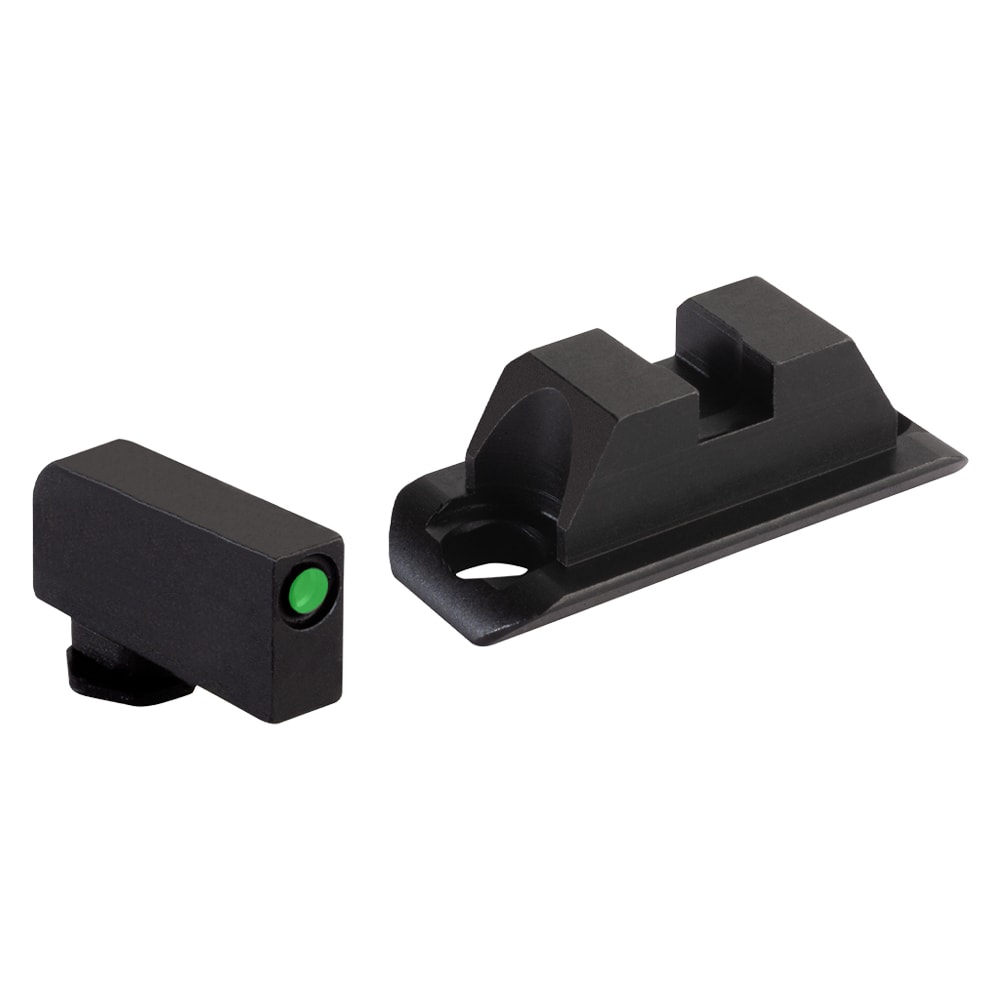 The AmeriGlo Green Tritium-Black Outline Front Sight is an optic-compatible sight set designed for use with Glock Gen 5 and 6 pistols. This set is part of a series engineered for "A-CUT/COA" compatibility, specifically intended to provide a clear iron sight picture through the window of slide-mounted red dot optics like the Aimpoint ACRO. It features a .240" tall front post containing a self-luminous green tritium lamp surrounded by a black outline to minimize distractions during red dot use. The rear sight is a flat black, square-notch design that helps reduce glare and ensures focus remains on the front sight or the optic's reticle.