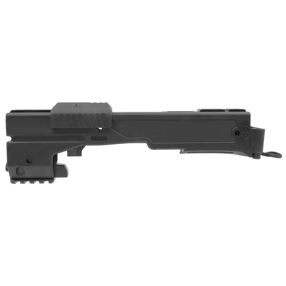 Upgrade your Walther PPQ with the USW Conversion Kit by B&T. Once installed, this kit offers excellent versatility and can considerably increase the effective range and accuracy of the host pistol. It features a minimalist folding stock – this gives the user the option of firing the pistol the traditional way when the stock is folded, and makes the weapon easier to carry in a holster. The stock can be deployed in less than a second, and greatly increases the weapon’s accuracy/range. This kit also allows the pistol to be mounted with a red dot sight on top of the chassis, and use the original iron sights as a backup.