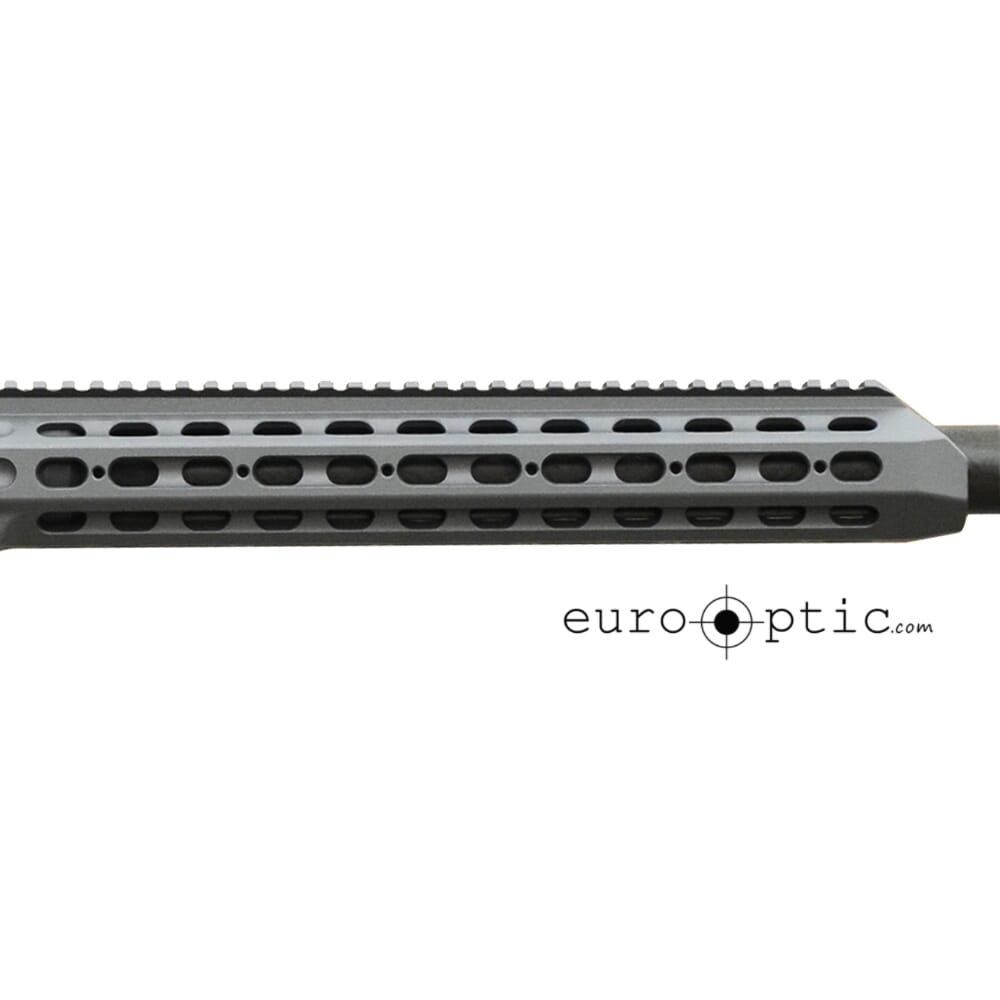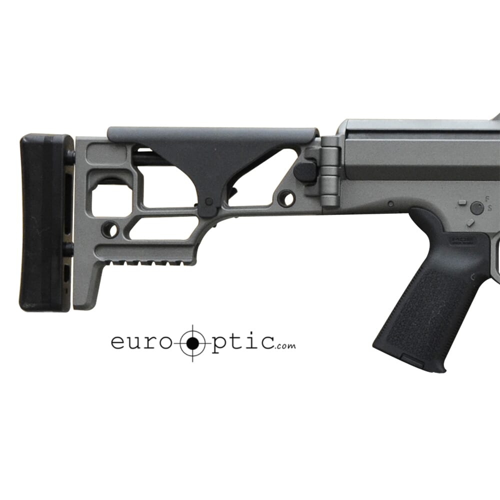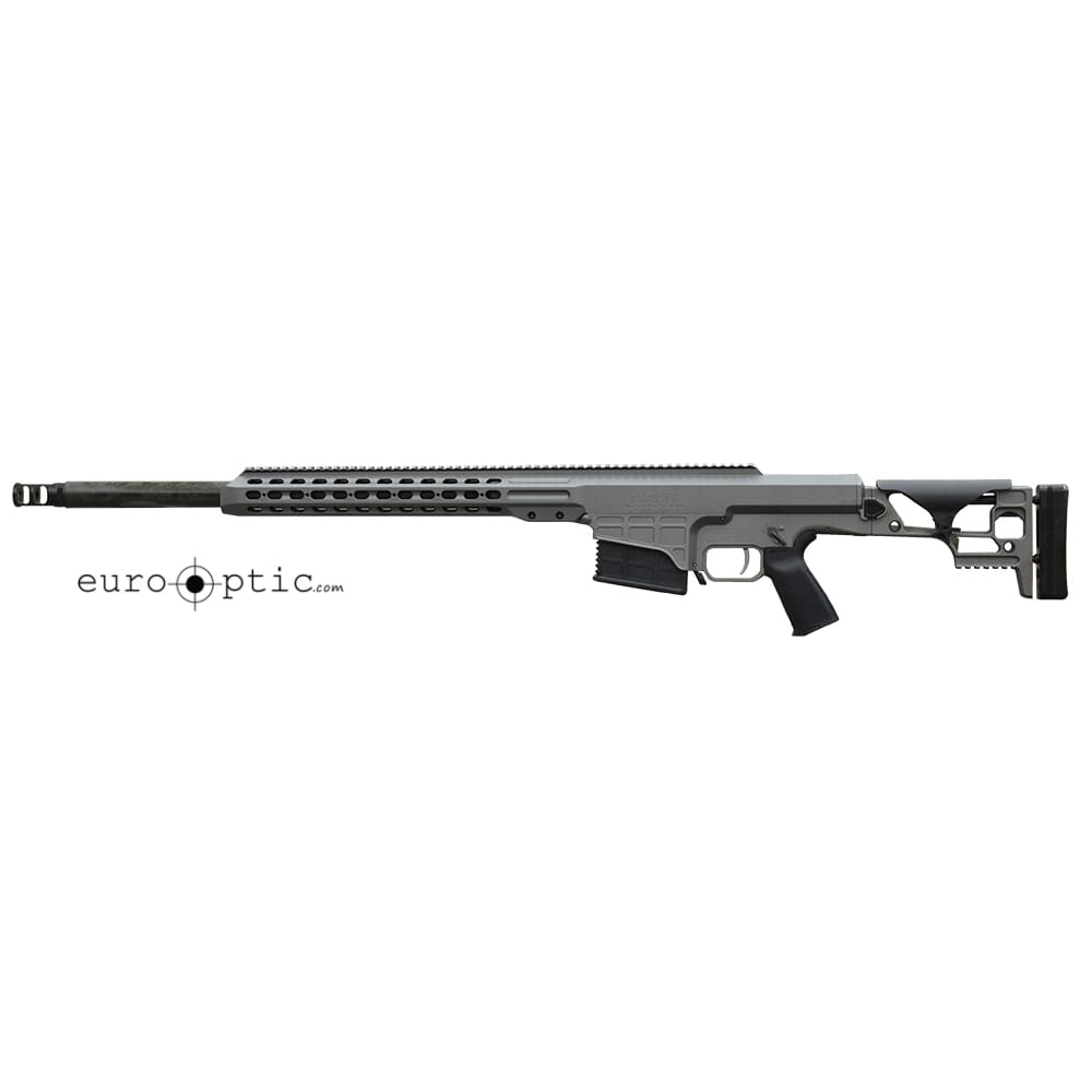 This Barrett MRAD 6.5 Creedmoor Rifle features a tungsten grey folding stock, 24" carbon fiber barrel, adjustable cheek piece, M1913 rail with 20 MOA taper, bolt guide for dust protection, ambidextrous magazine release, front-loading barrel design, single button length of pull adjustment, thumb-operated safety, removable combat-proof trigger module, and the ability to accept standard M4/M16 pistol grips.