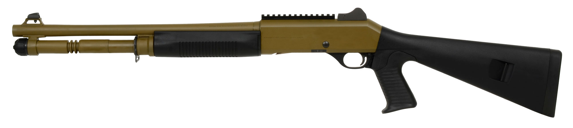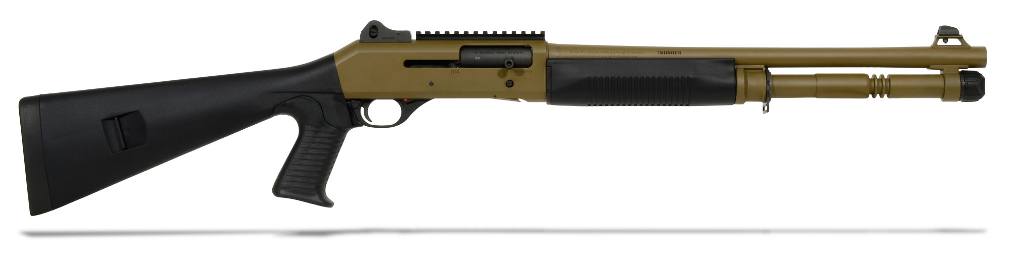 This battle-proven, tactical Benelli M4 12-gauge shotgun features a black synthetic, AI Dark Earth Cerakote design, pistol grip, ghost-ring sight, and picatinny rail.