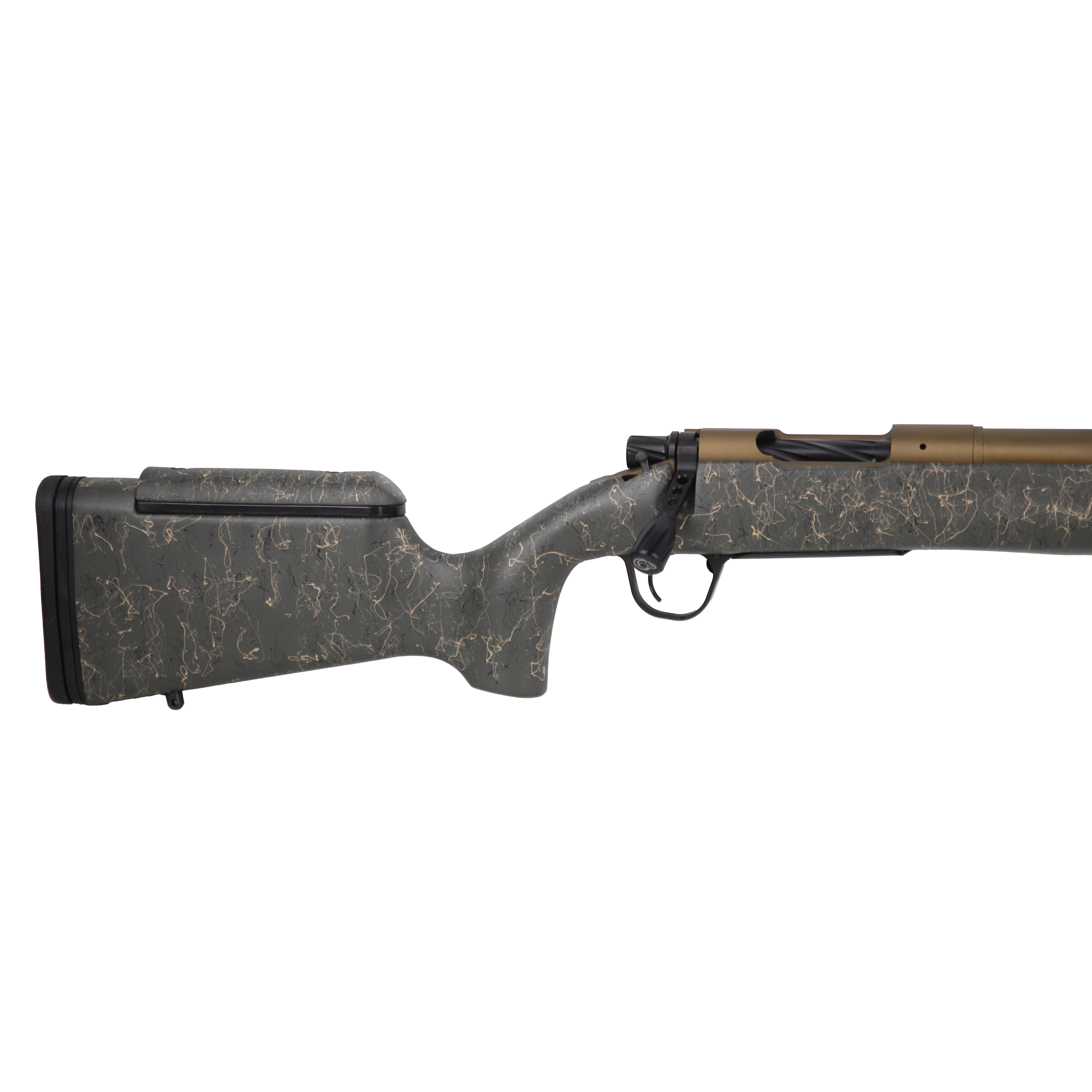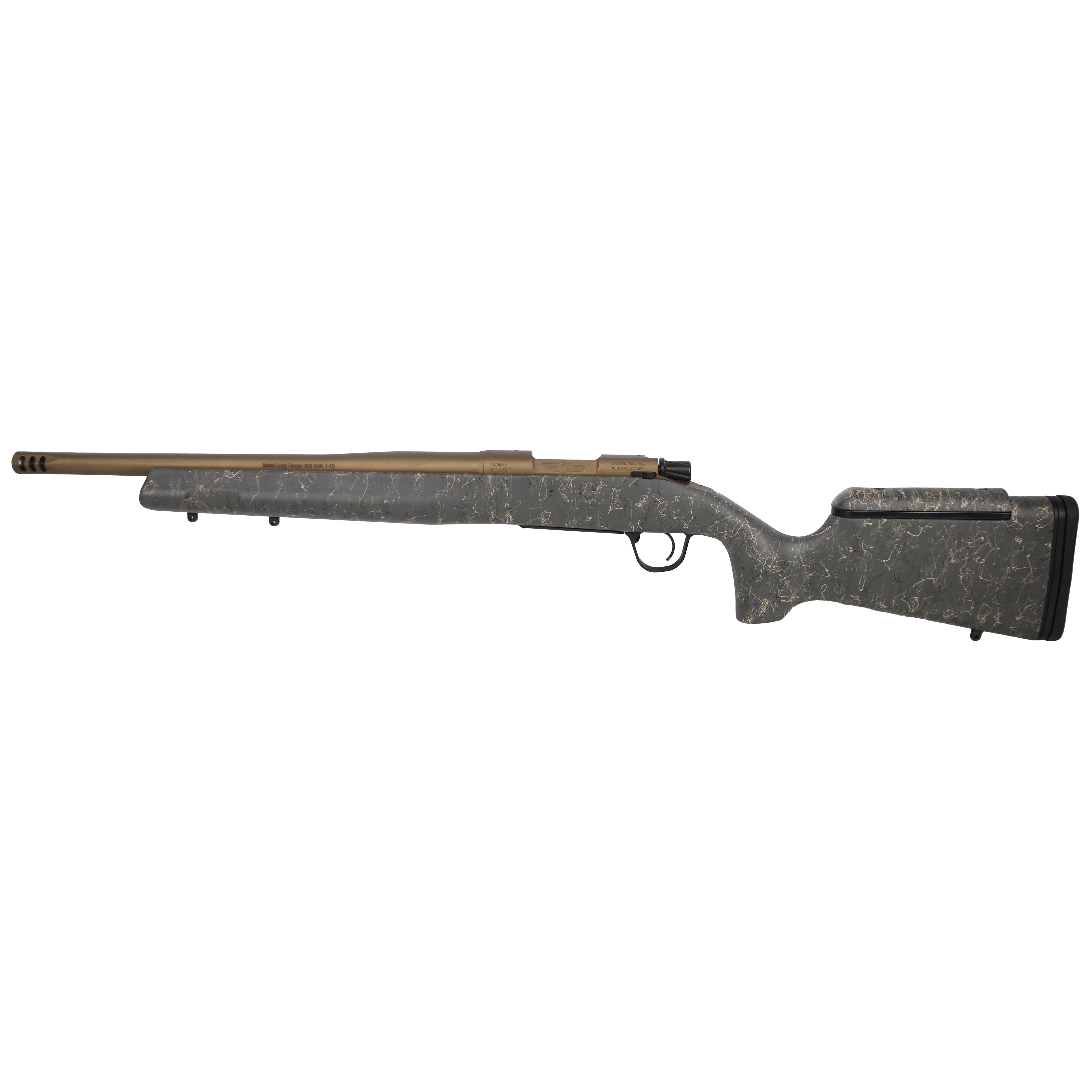 Experience precision and performance with the Mesa .308 Win Bolt Action Rifle. Designed for the discerning shooter, this rifle features a 16.25-inch barrel with a 1:10 twist, finished in a durable Burnt Bronze Cerakote for enhanced longevity and a unique, rugged look. The long-range stock, finished in a distinctive green with black and tan webbing, offers a secure and comfortable grip, ensuring stability and control with every shot.