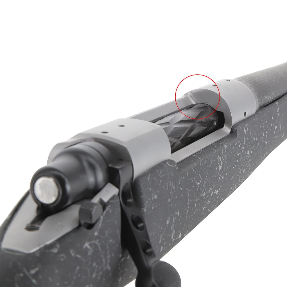 This custom built Christensen Arms Carbon One .338 Rem Ultra Mag rifle includes a stainless action, 26" barrel, Timney trigger, custom muzzle brake, and a black stock with gray webbing.