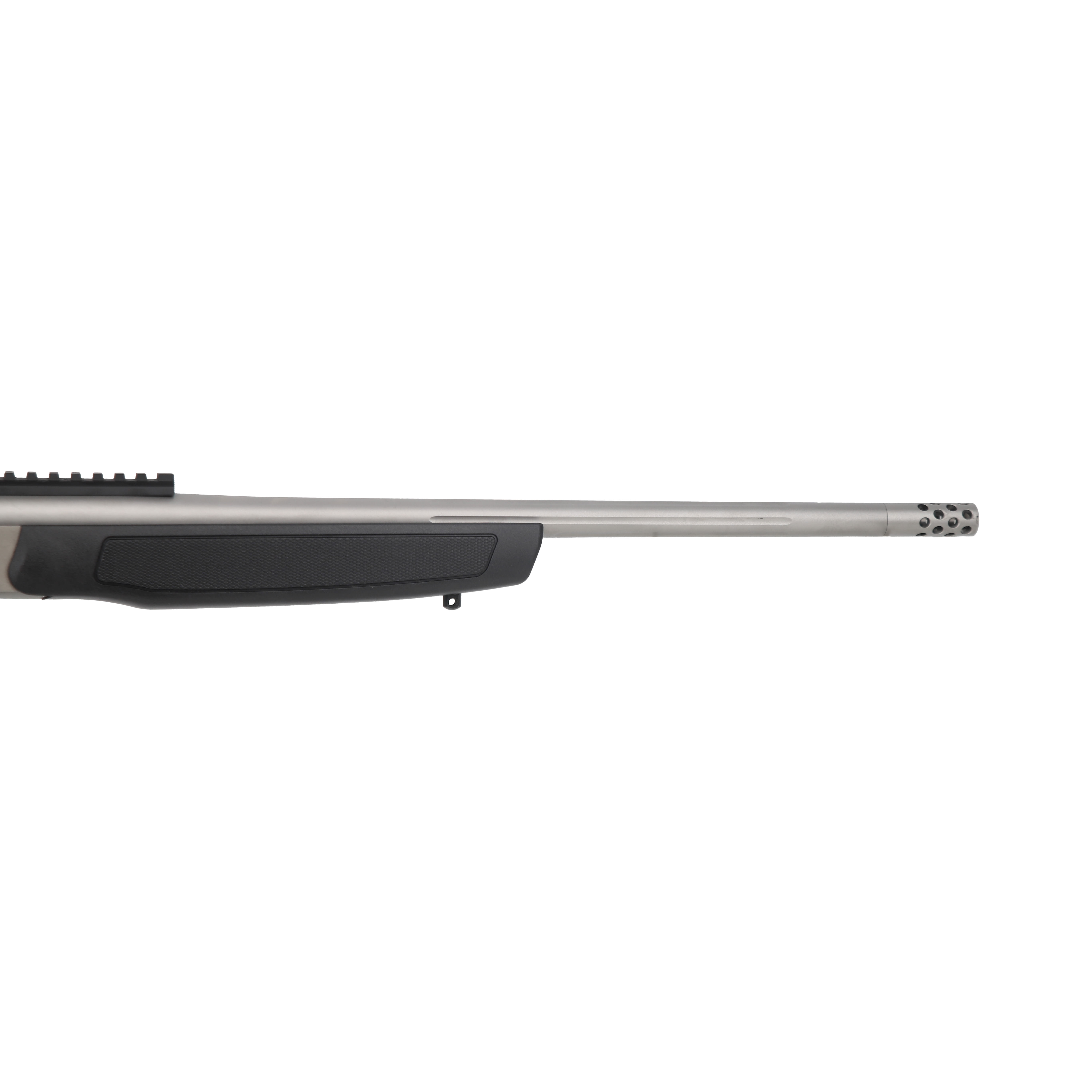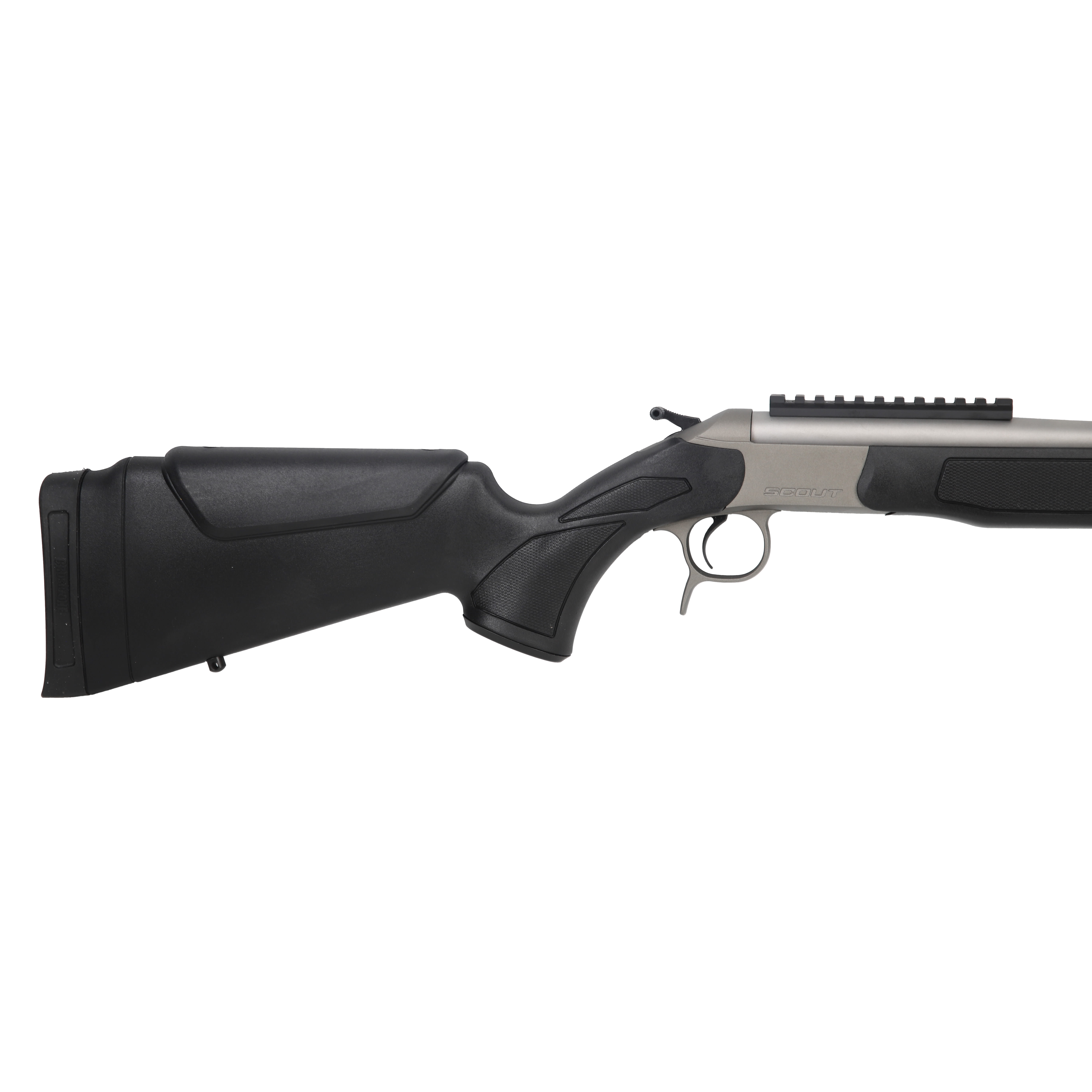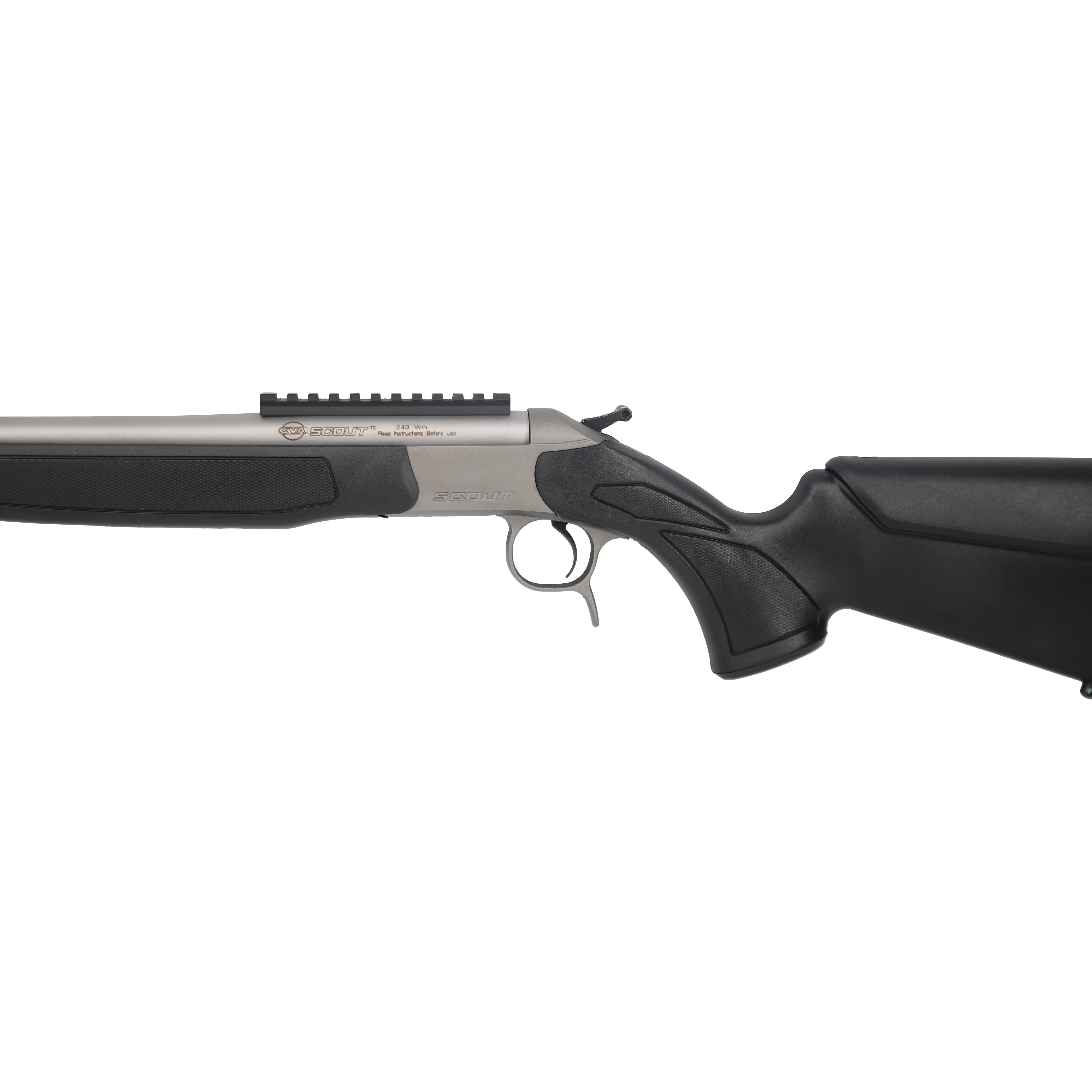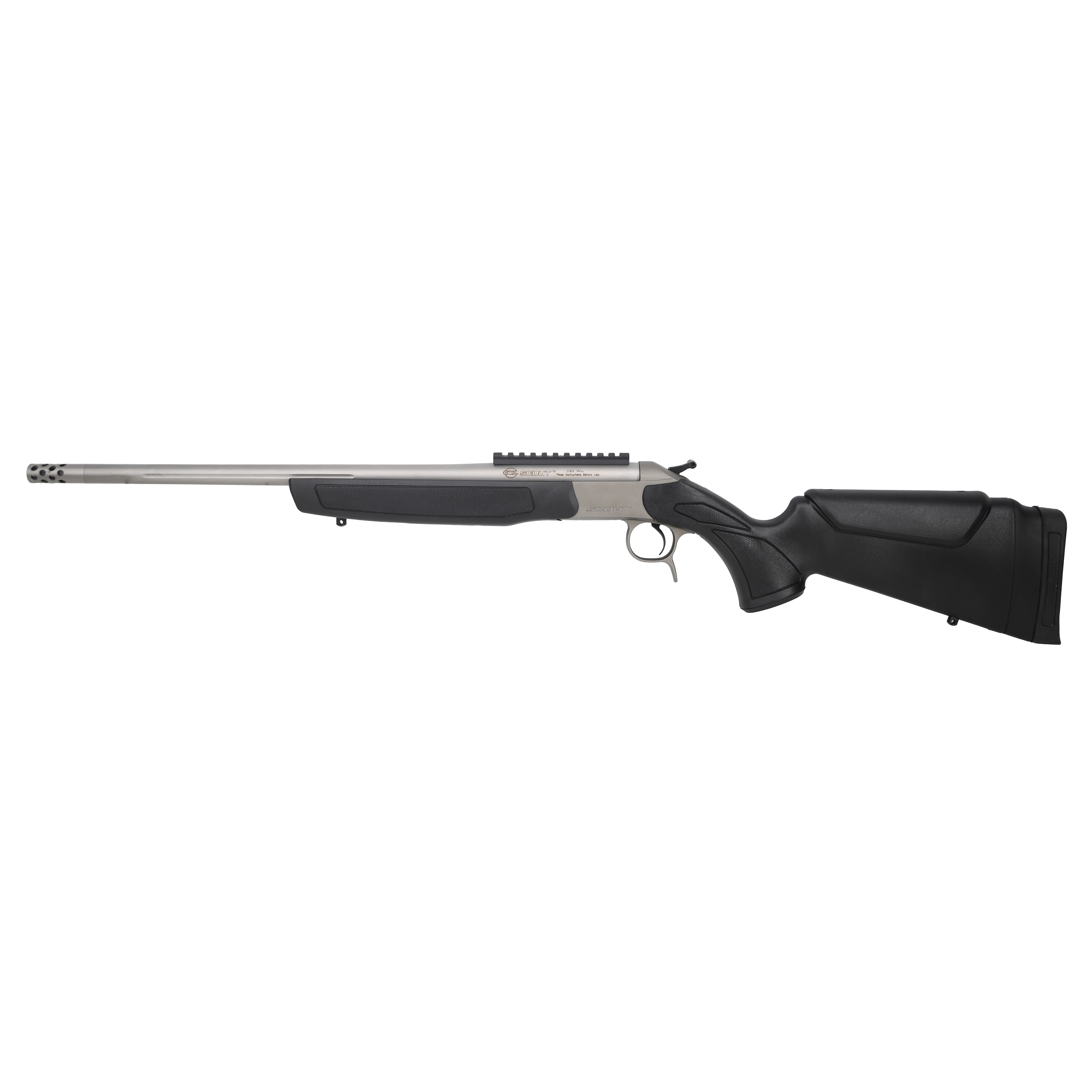 The CVA Centerfire Scout SS TD .223 Rem is a single‑shot, break‑action centerfire rifle chambered for the .223 Remington cartridge, built to offer a straightforward, optics‑ready platform with recoil‑mitigating features. It is equipped with a 20‑inch barrel featuring a 1:9" twist rate and a 5/8×24 threaded muzzle, and it includes a thread protector for use when no muzzle device is installed. The barrel and receiver are finished in stainless steel with black accents, and the rifle is mounted in a black synthetic stock designed for durability and consistent handling in the field. This Scout SS TD model includes a 0 MOA Picatinny rail on the receiver for straightforward optics mounting and a factory‑installed Omni muzzle brake to help reduce felt recoil and muzzle rise. With its threaded barrel, optics‑ready rail, and simple single‑shot break‑action design, the Scout SS TD .223 Rem provides a balanced centerfire rifle configuration suited to hunting, range work, and general shooting applications where a lightweight, recoil‑managed rifle is preferred.