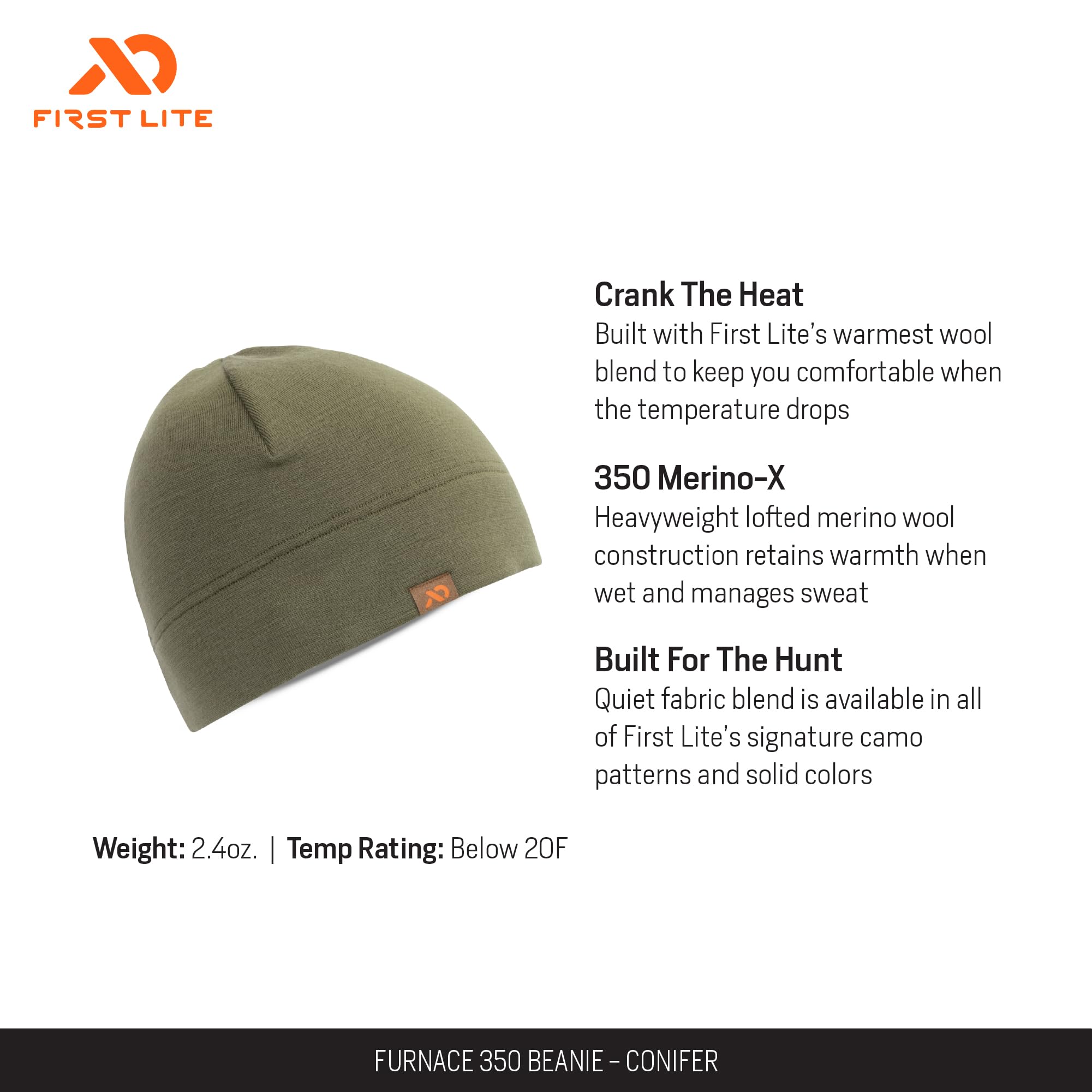 Stay warm and comfortable during your cold weather pursuits with the First Lite Furnace 350 Beanie. Designed for the dedicated outdoorsman, this beanie delivers exceptional insulation and breathability, making it the perfect companion for chilly mornings, late-season hunts, and winter hikes. The conifer green color ensures you blend seamlessly with your natural surroundings, while the beanie's one-size-fits-all design provides a snug, comfortable fit for a wide range of head sizes. Crafted with premium, durable materials, the Furnace 350 Beanie is built to withstand the rigors of the outdoors, offering reliable performance season after season. Whether you're glassing a ridgeline, setting up camp, or trekking through the backcountry, this beanie is your go-to for warmth and versatility.
