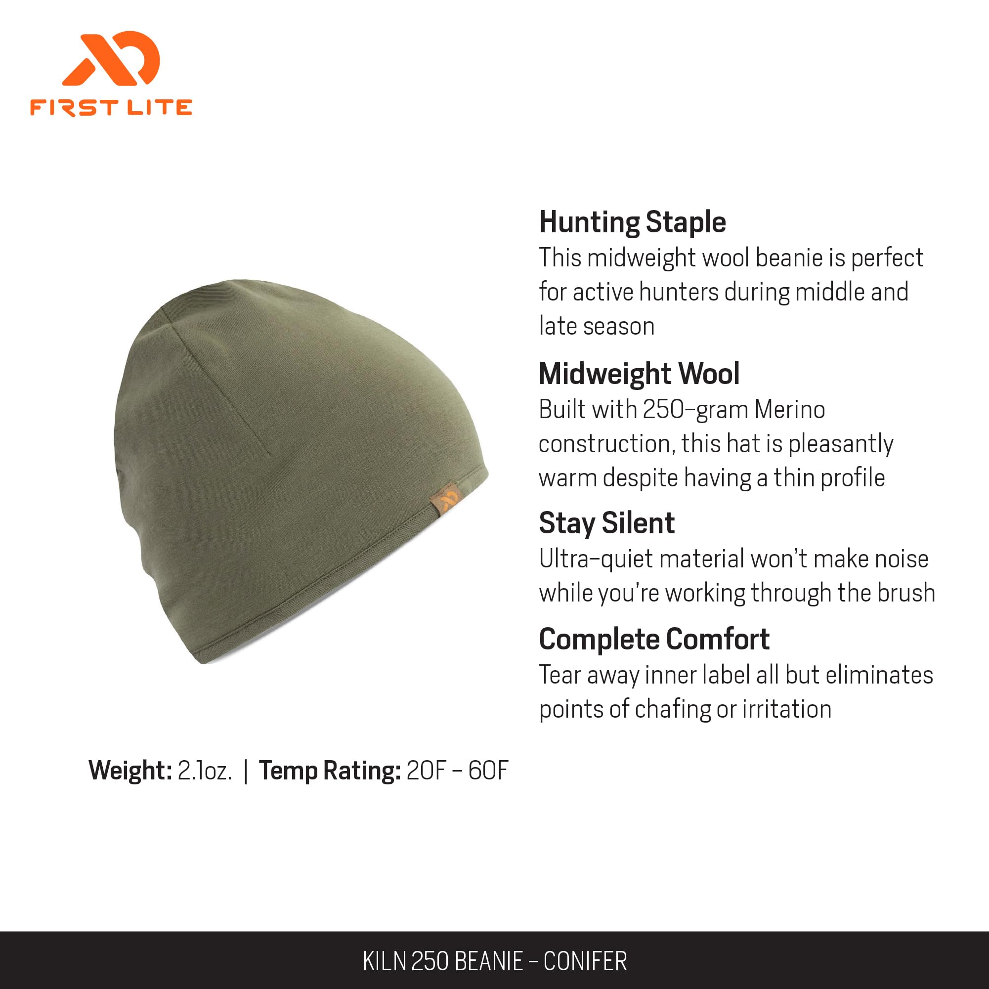 Stay warm and comfortable on your outdoor adventures with the First Lite Kiln 250 Beanie. Designed for those who demand both performance and style, this beanie is crafted with the outdoor enthusiast in mind. Its thoughtfully engineered fabric delivers the perfect balance of insulation and breathability, ensuring your head stays cozy without overheating. The beanie's conifer green hue is inspired by the natural world, making it the perfect companion for both the trail and the town. Whether you're hiking, camping, or simply enjoying a brisk morning, this beanie's soft, lightweight construction and universal fit promise all-day comfort and a secure, snug feel. Elevate your cold-weather gear with a beanie that's as versatile as your adventures.