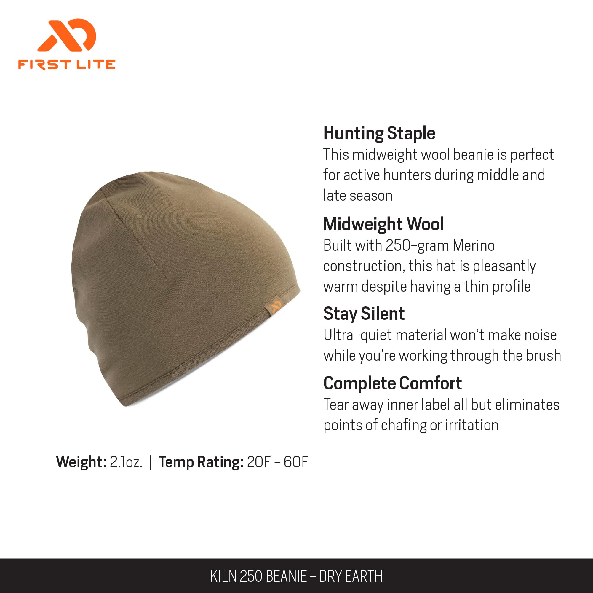 Stay cozy and protected from the elements with the First Lite Kiln 250 Beanie. Designed for those who demand both performance and style, this beanie is the perfect companion for brisk mornings, chilly hikes, and everyday adventures. The Dry Earth color blends seamlessly with natural surroundings, making it a versatile choice for both the field and the city. Its expertly engineered construction ensures a snug, comfortable fit for all, while the premium materials provide reliable warmth and durability. Whether you're heading out for a hunt, a hike, or simply running errands, the Kiln 250 Beanie is built to keep you comfortable and looking sharp all season long.