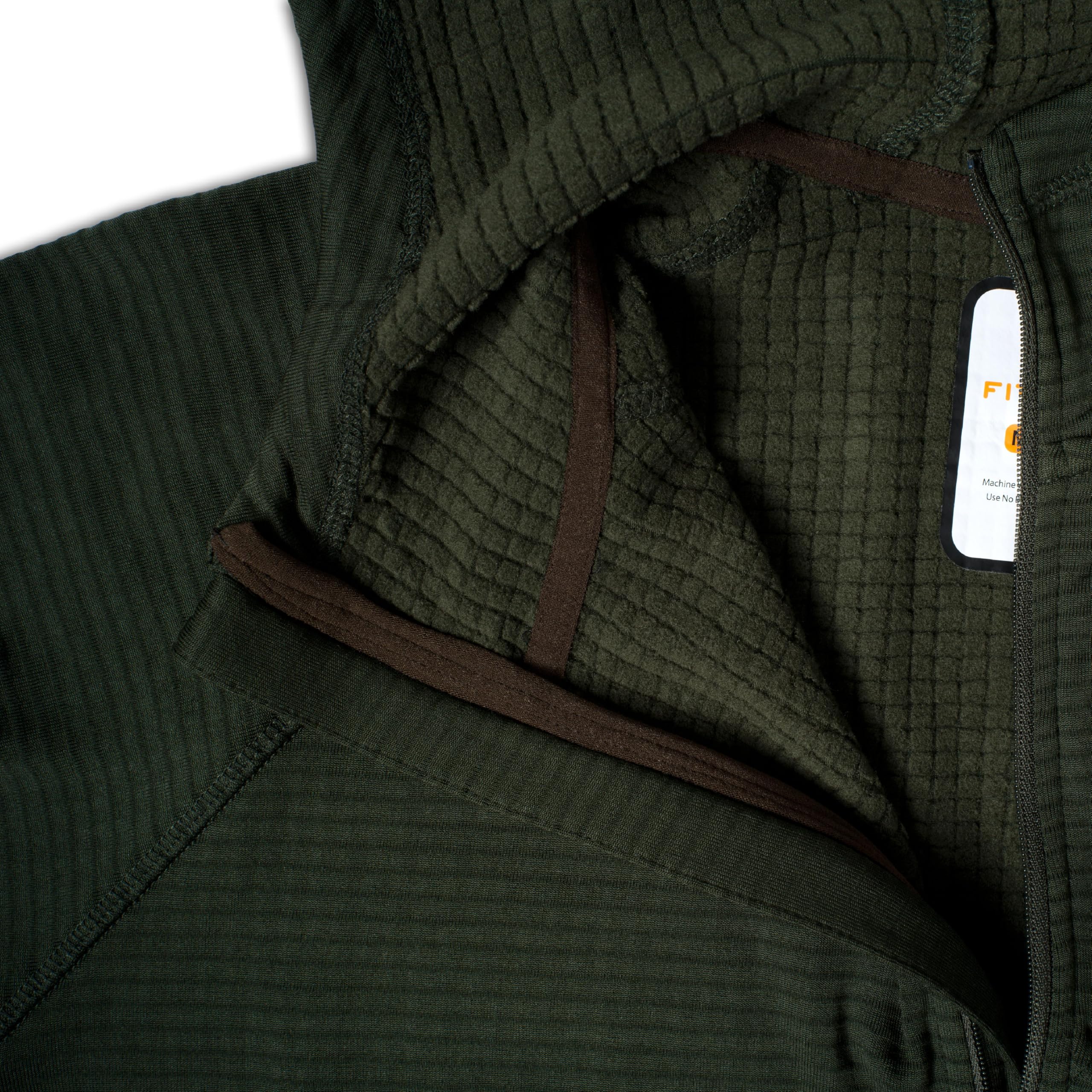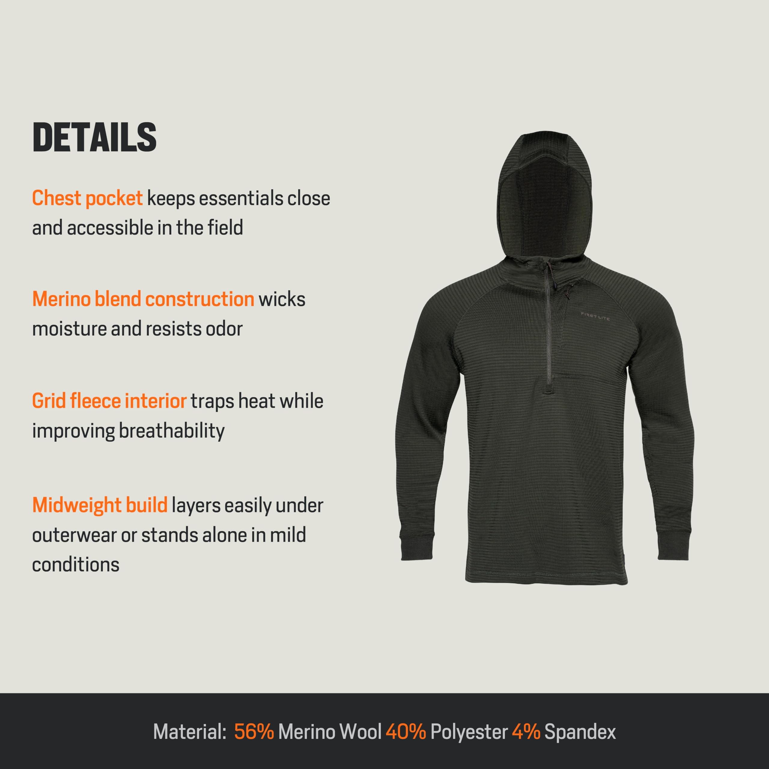 Engineered for those who demand performance and comfort in the harshest conditions, the First Lite Men's ThermaGrid Merino Hoody is the ultimate companion for cold weather pursuits. Crafted with the adventurer in mind, this hoody leverages the natural properties of Merino wool, ensuring you stay dry, fresh, and warm, whether you're trekking through the backcountry or layering up for a chilly morning hunt. The ThermaGrid construction traps heat efficiently, providing a cozy, breathable barrier against the cold, while the Dark Moss color blends seamlessly with natural surroundings for a discreet, stylish look. Designed with multiple sizing options in mind, this hoody offers a relaxed, non-restrictive fit, making it perfect for layering and all-day comfort. Elevate your cold weather layering system with a hoody that works as hard as you do, keeping you warm, dry, and ready for the next adventure.