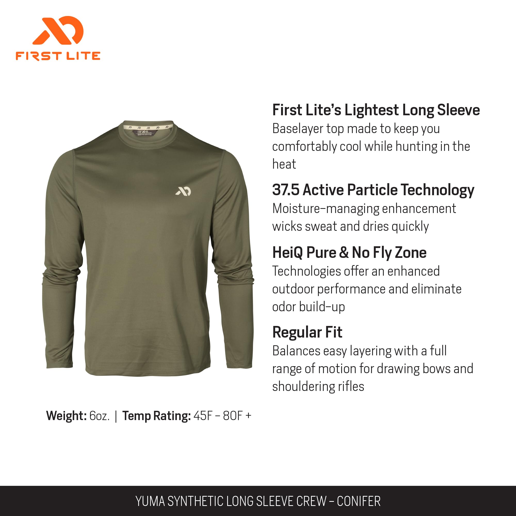 Engineered for the demands of the outdoors, the First Lite Men's Yuma Synthetic Long Sleeve Crew is the ultimate companion for your next adventure. Designed for versatility, this crew shirt is crafted from advanced synthetic materials that excel in regulating your body temperature, whether you're hiking, hunting, or layering up for a chilly morning. The conifer green hue blends seamlessly with natural surroundings, making it a smart choice for those who value both performance and subtle style. The shirt's lightweight, breathable construction ensures you stay comfortable and focused, while the moisture-wicking technology actively pulls sweat away from your skin, keeping you dry and fresh from dawn to dusk. Perfect for wearing on its own or as a base layer, the Yuma Crew is a reliable staple for any outdoor enthusiast's wardrobe.
