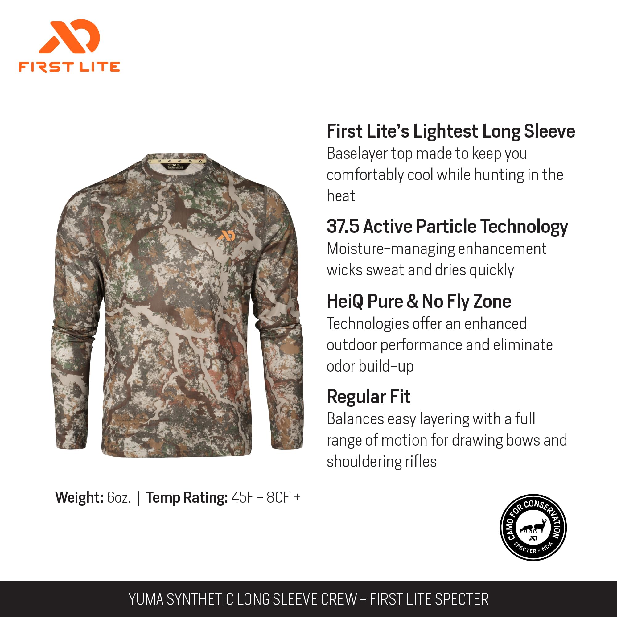 Engineered for the demands of the outdoors, the First Lite Men's Yuma Synthetic Long Sleeve Crew is the ultimate companion for active pursuits in changing weather. Crafted with advanced Specter fabric, this shirt delivers the perfect balance of lightweight insulation and superior moisture management, ensuring you stay warm and dry whether you're hiking, hunting, or layering for a chilly morning. The relaxed fit is designed for unrestricted movement and all-day comfort, while the shirt's durable, breathable construction stands up to the rigors of the wild. Ideal for layering, the Yuma Crew is a versatile staple for anyone who refuses to let the weather dictate their adventure.