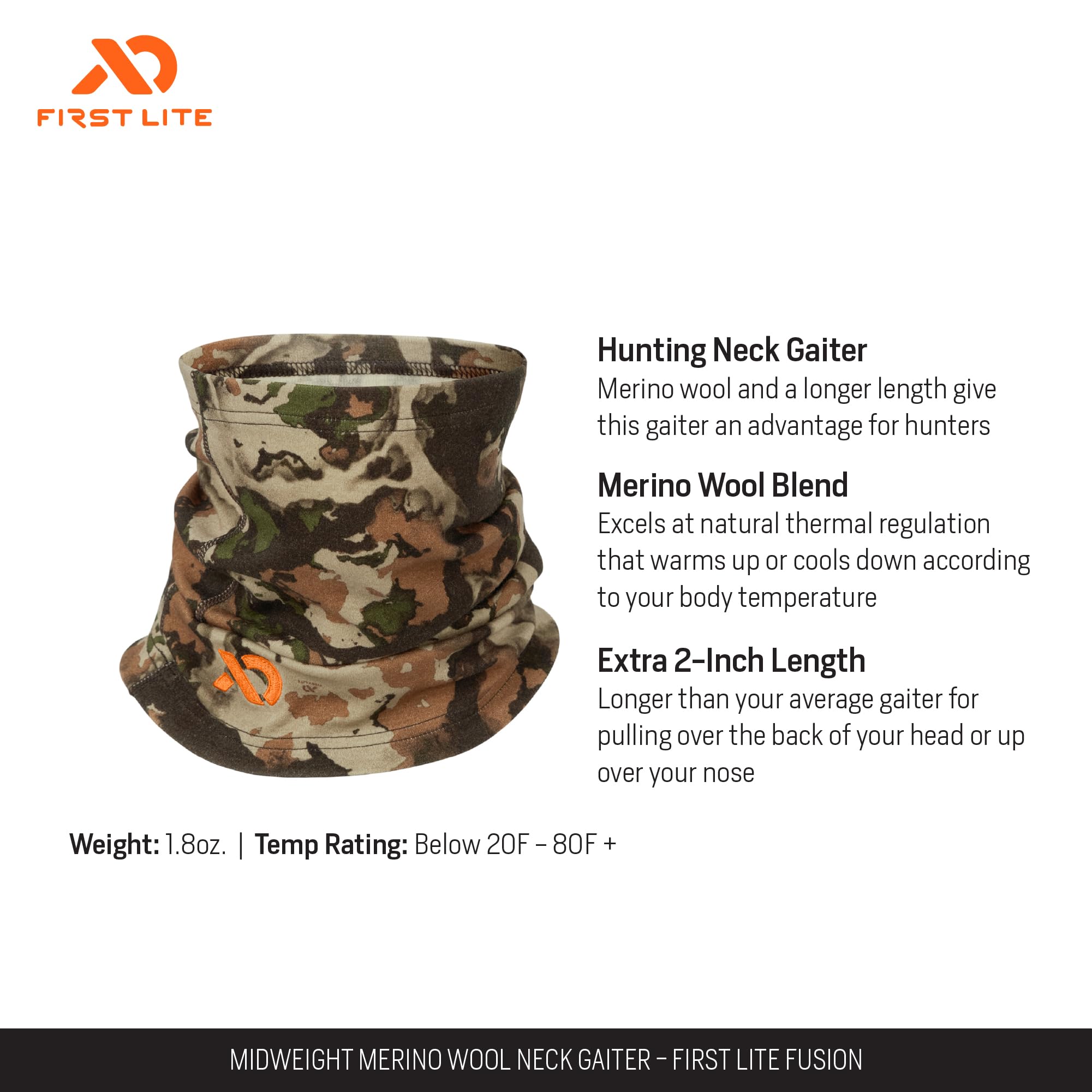 Stay comfortable and protected in changing conditions with the First Lite Midweight Neck Gaiter in Fusion. Designed for the outdoor enthusiast who demands both performance and style, this gaiter offers the perfect balance of warmth and breathability. Its soft, moisture-wicking fabric ensures you stay dry and comfortable, whether you're powering up a mountain trail, carving through fresh powder, or logging miles on a brisk morning run. The Fusion color pattern delivers a modern, eye-catching look, while the flexible, one-size-fits-all design ensures a secure and comfortable fit for any adventure. Lightweight and easy to pack, this gaiter is a must-have for anyone who refuses to let the weather slow them down.