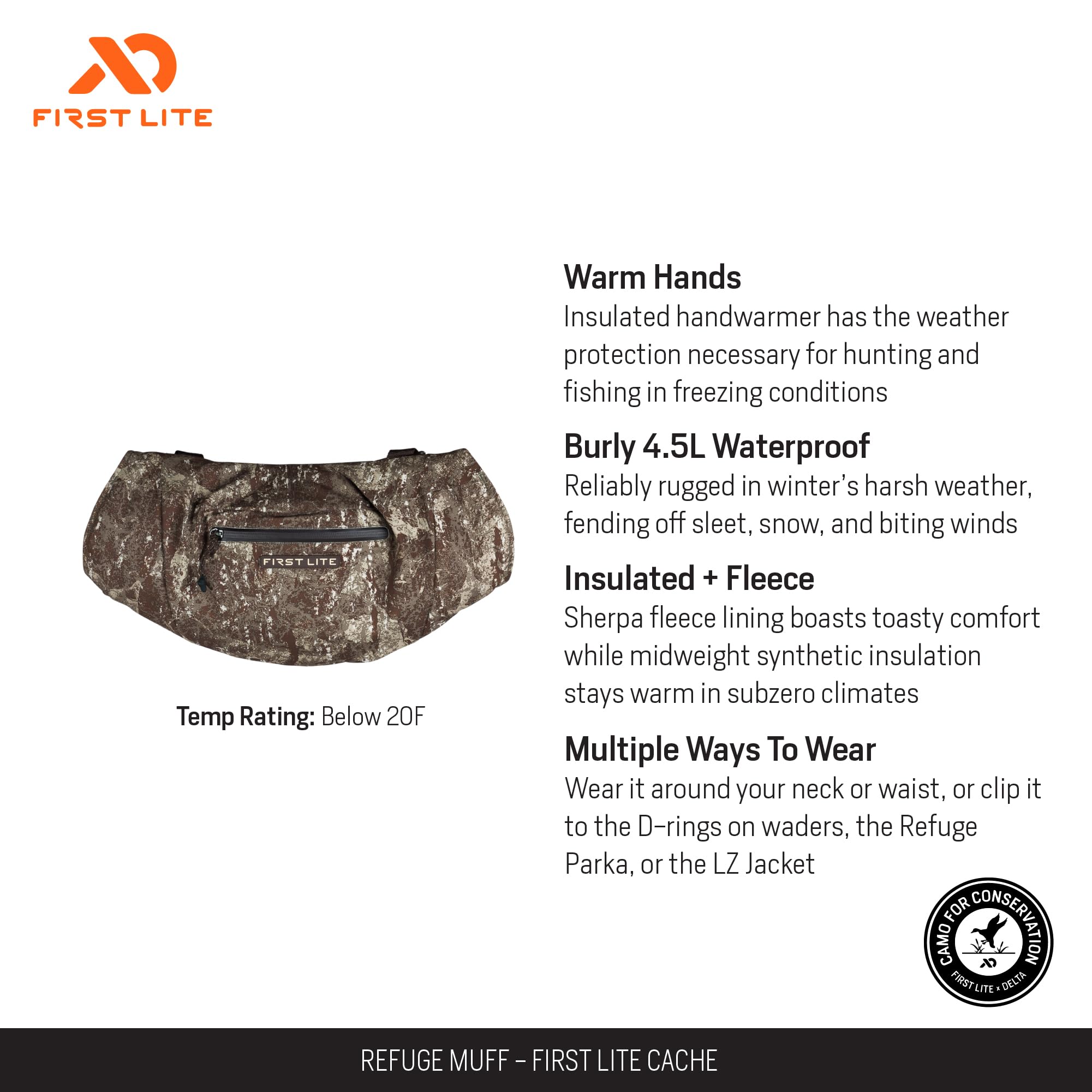 Stay warm and focused during your cold weather pursuits with the First Lite Refuge Muff in the versatile Darkwater color. Designed for the dedicated outdoorsman, this muff delivers exceptional insulation and comfort, ensuring your hands remain protected from the elements during long hours in the field. Its rugged construction and high-quality materials guarantee long-lasting performance, while the one-size-fits-most design offers effortless convenience for any adventure. Whether you're glassing for game, setting decoys, or waiting in the blind, the Refuge Muff is your reliable companion for warmth and comfort in the harshest conditions.