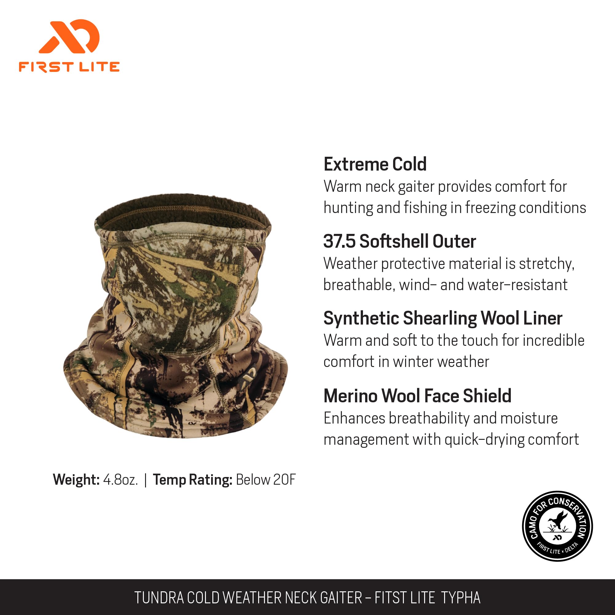 Stay protected from biting winds and frigid temperatures with the First Lite Tundra Neck Gaiter in Typha. Designed for the dedicated outdoors enthusiast, this gaiter delivers the perfect balance of warmth and breathability, making it an essential companion for hunting, hiking, and winter expeditions. The Typha fabric not only insulates against the cold, but also feels soft against the skin, ensuring comfort from dawn to dusk. Its lightweight construction means it won't weigh you down, and the durable build stands up to the rigors of the wild. Whether you're glassing from a ridge or trekking through snow, the Tundra Neck Gaiter keeps you warm, comfortable, and ready for the next adventure.