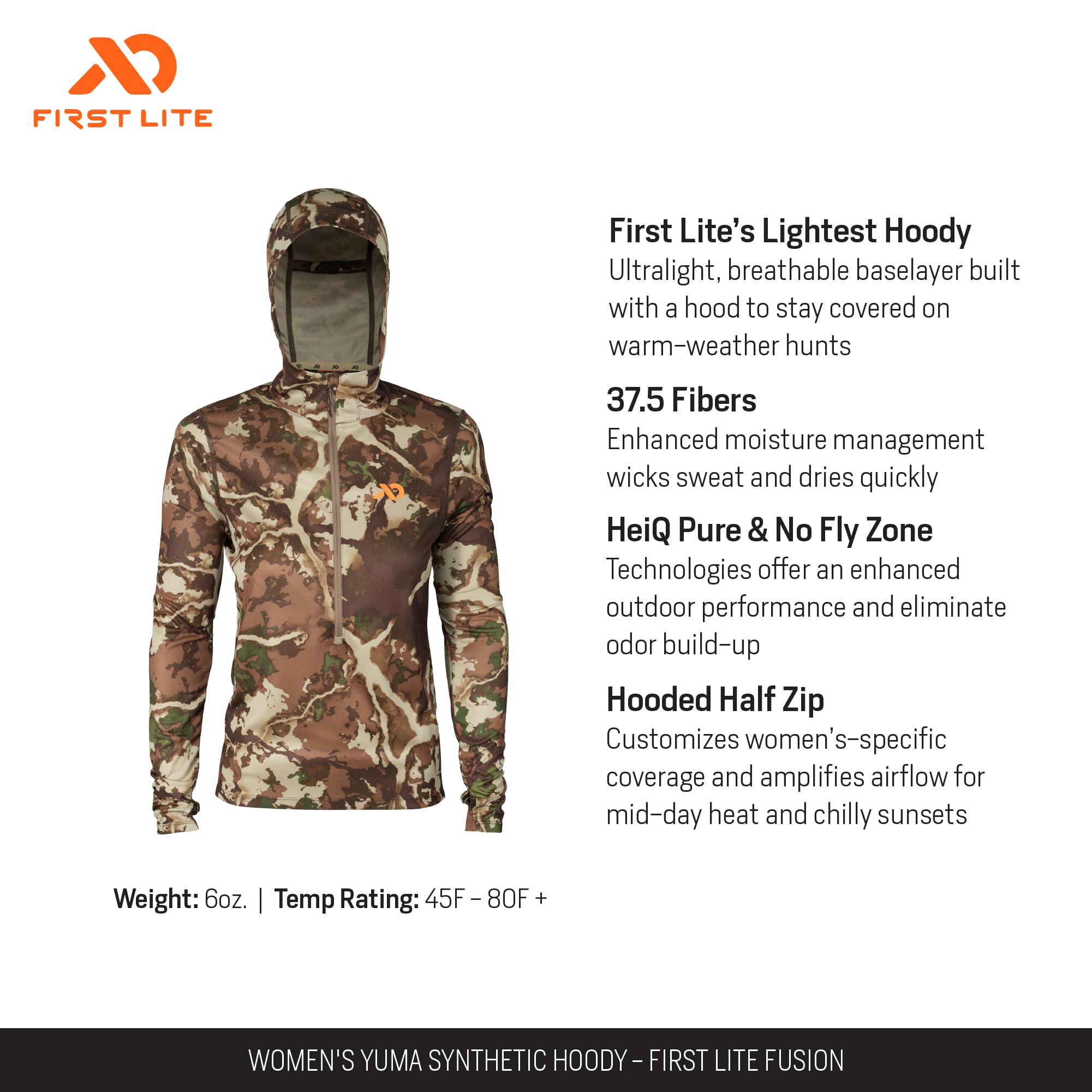 The First Lite Women's Yuma Synthetic Hoody is engineered for women who demand performance and versatility in their outdoor apparel. Crafted for adventure, this hoody is the perfect companion for everything from brisk morning hikes to cool evenings around the campfire. Its advanced synthetic construction ensures you stay warm and comfortable, while the breathable design prevents overheating during active pursuits. The Yuma Hoody is thoughtfully tailored for a flattering fit and features a protective hood, making it a reliable choice for unpredictable weather. Whether you're layering it under a shell or wearing it solo, this hoody seamlessly blends style and function, making it a staple for hiking, camping, or everyday wear in the outdoors.