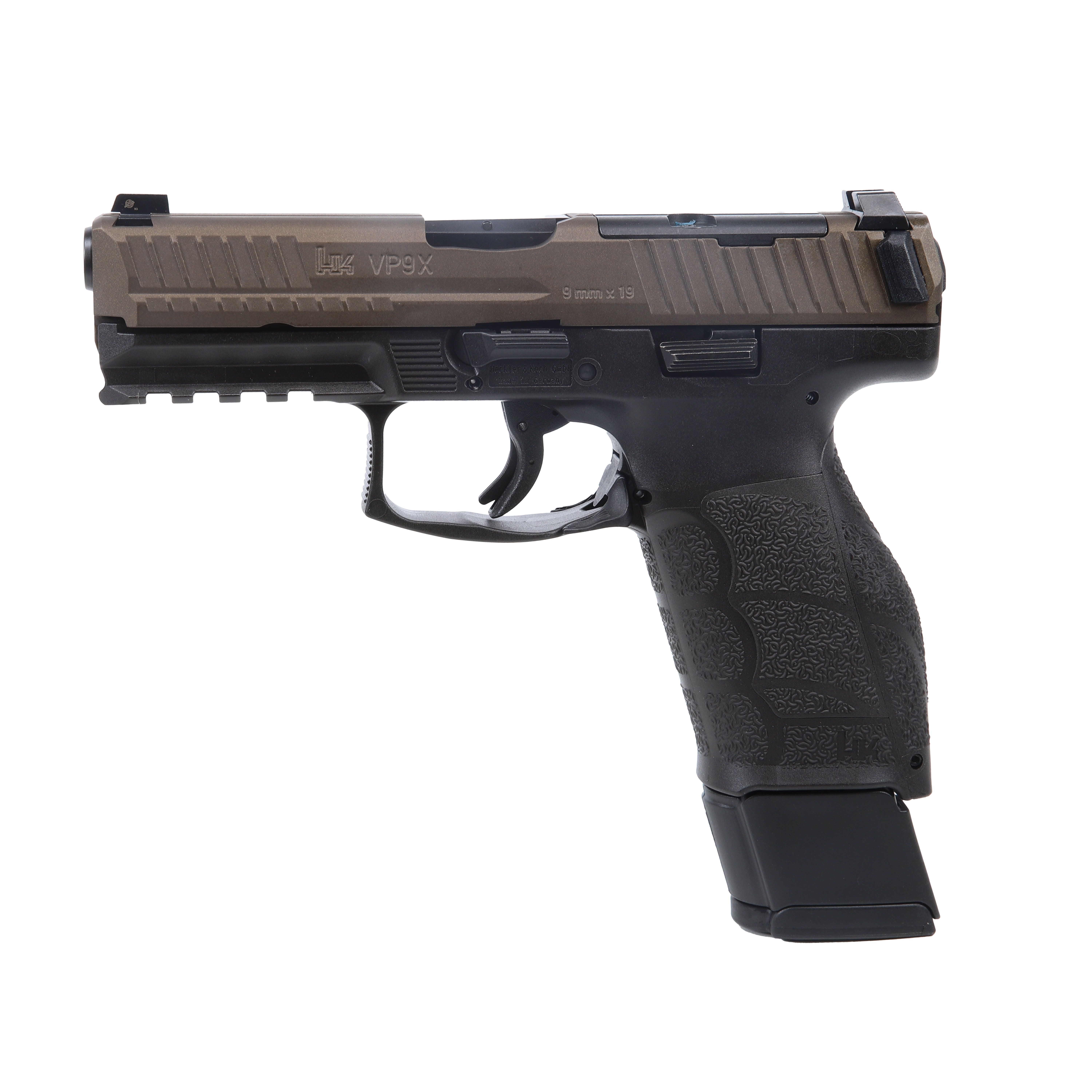 The HK VP9A1 X Crossover 9mm with a 4.09" barrel and optics-ready configuration on a 17-round frame in PI Midnight Bronze is a versatile striker-fired handgun that blends tactical styling with modern performance features. Its optics-ready slide allows for easy installation of a miniature red-dot sight to support quicker target acquisition and an enhanced sight picture, while the compact 4.09″ barrel balances maneuverability with controlled follow-up shots. The ergonomic grip and intuitive controls promote consistent handling in both defensive and range environments, and the integrated accessory rail accommodates lights or other compatible attachments for expanded capability. This configuration includes one 17-round and one 20-round magazine, offering flexible capacity options where permitted. With precision engineering, distinctive finish, and practical design, the VP9A1 X Crossover delivers dependable performance and adaptability in a modern, compact package.