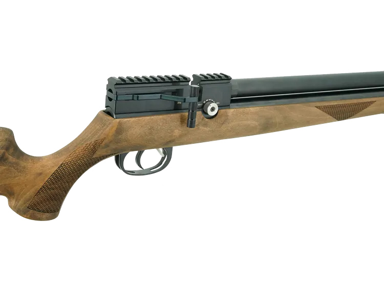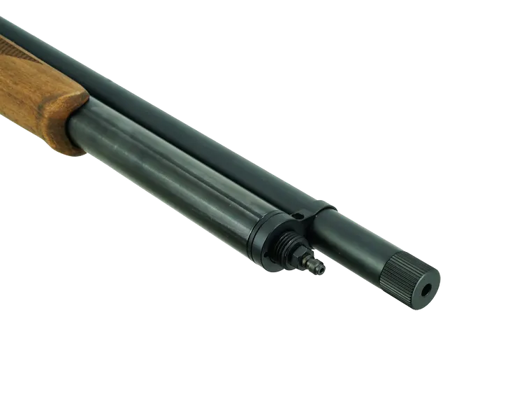 What sets the Airacuda apart is its thoughtful design and adjustability at an accessible price point. The adjustable power knob allows shooters to fine-tune performance based on pellet choice and shooting needs, while the solid wood stock with laser-engraved checkering provides a secure, comfortable grip. With features like an integrated manometer, Foster quick-disconnect fill fitting, and a durable Picatinny optics rail, this air rifle is built for convenience, customization, and consistent accuracy in the field or at the range.