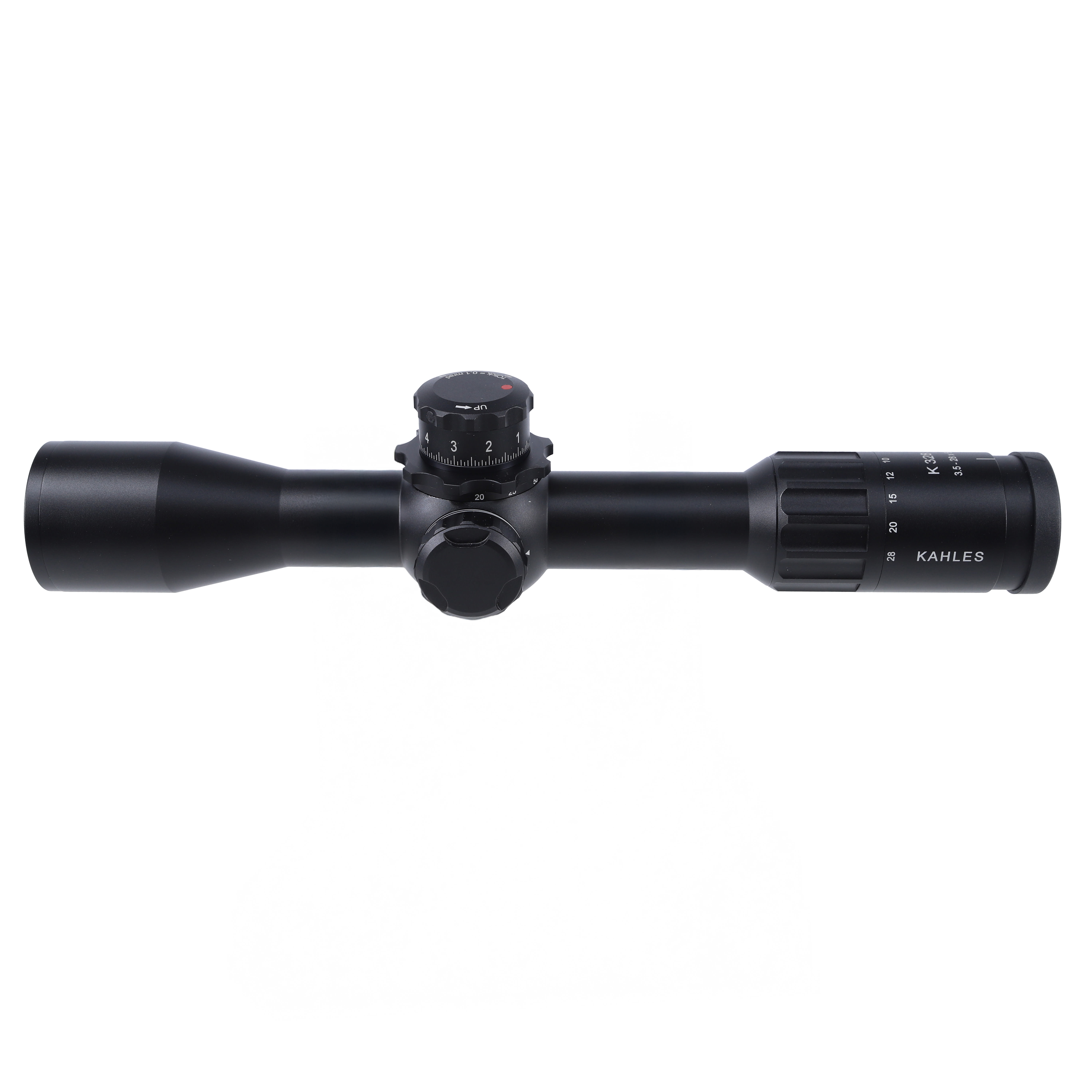 The windage turret of the Kahles K328i DLR Riflescope features a Zero Stop function, ensuring a quick return to the original zeroing point, and a twist guard to prevent unintended adjustments. Both the windage and elevation turrets boast clear and well-defined clicks, adding to the user-friendly design.