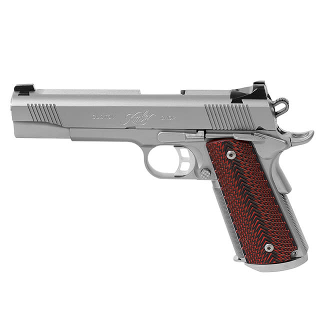 This Kimber 1911 Gold Combat Stainless II .45 ACP pistol features tritium 3-dot night sights with cocking shoulder, 5" bushingless match grade bull barrel, frame and slide machined from solid stainless steel with a satin silver finish, 24 lines-per-inch front strap checkering, herringbone-pattern Micarta grips, extended and beveled magazine well, and an aluminum match grade trigger.