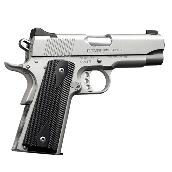 This Kimber 1911 Stainless Pro Carry II 9MM pistol features an extended beavertail grip, thumb safety, low profile sights mounted in machined dovetails with rounded edges to avoid snagging, 4" match grade bushingless bull barrel, black synthetic double diamond grips, aluminum match grade trigger, stainless steel slide and aluminum frame with a satin silver finish.