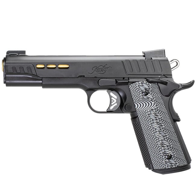 The slide and frame of the Kimber Rapide are finished with Kimbers ultra-durable KimPro II black finish designed to resist chemicals, moisture, salt, and even UV light. The lightening cuts found on both sides of the slide reduce weight for faster locking while showing off TiN finish of the barrel. The Rapide provides a superior grip using front and rear strap texturing and the G-10 WavZ stippled grip. The pistol is topped off with Tru-Glos TF X Pro Day/Night Sights so you can feel comfortable deploying the Rapide in all lighting conditions. For those looking for a 1911 that is as eye-catching as it is reliable and accurate, the Kimber Rapide will not just meet expectations, but surpass them.