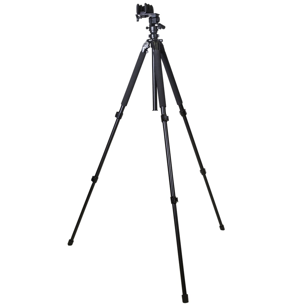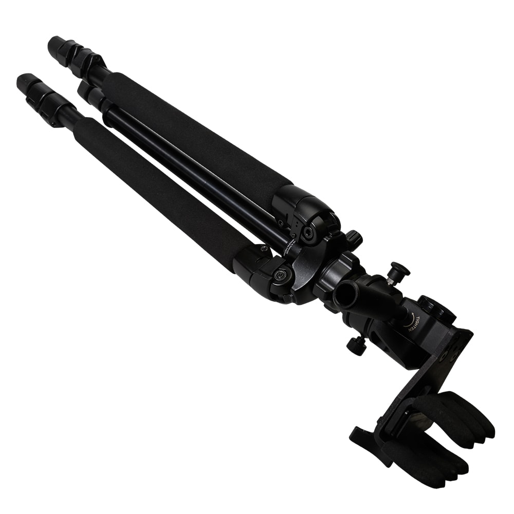 The Kopfjager K700 AMT Aluminum Tripod with Reaper Grip (KJ85001K) is a rugged, precision-oriented video tripod system engineered for long-range shooting applications. Constructed from heavy-duty aluminum, the tripod features 3-level leg extensions with lever locks, and a reversible center column. The included Reaper Grip provides a pivoting, lockable rest that accommodates tapered or straight stocks, enabling stable, recoil-resistant operation. The tripod offers 360° smooth panning and a tilt movement range of 109° (21° upward / 87° downward), making it well suited for demanding outdoor and precision setups.