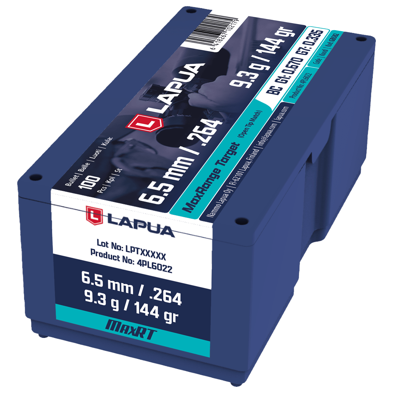 The Lapua 6.5mm 144gr MaxRange Target OTM is Lapua's highest-BC 6.5mm match bullet to date, engineered specifically for ELR and long-range competitive disciplines where superior ballistics and consistency at distance are non-negotiable. Its boat tail design and optimized ogive deliver a G1 BC of 0.670 and a G7 BC of 0.335 — placing it among the elite low-drag projectiles available in any 6.5mm offering — with a form factor that yields a streamlined trajectory and improved transonic stability. At 1.370" OAL it fits naturally in a wider range of magazine-fed platforms than competing designs of similar performance, making it a practical choice for PRS and F-Class competitors alike. Packaged 100 per box, this is a premium component bullet built to the exacting standards that have made Lapua a trusted name among the world's most demanding precision shooters.