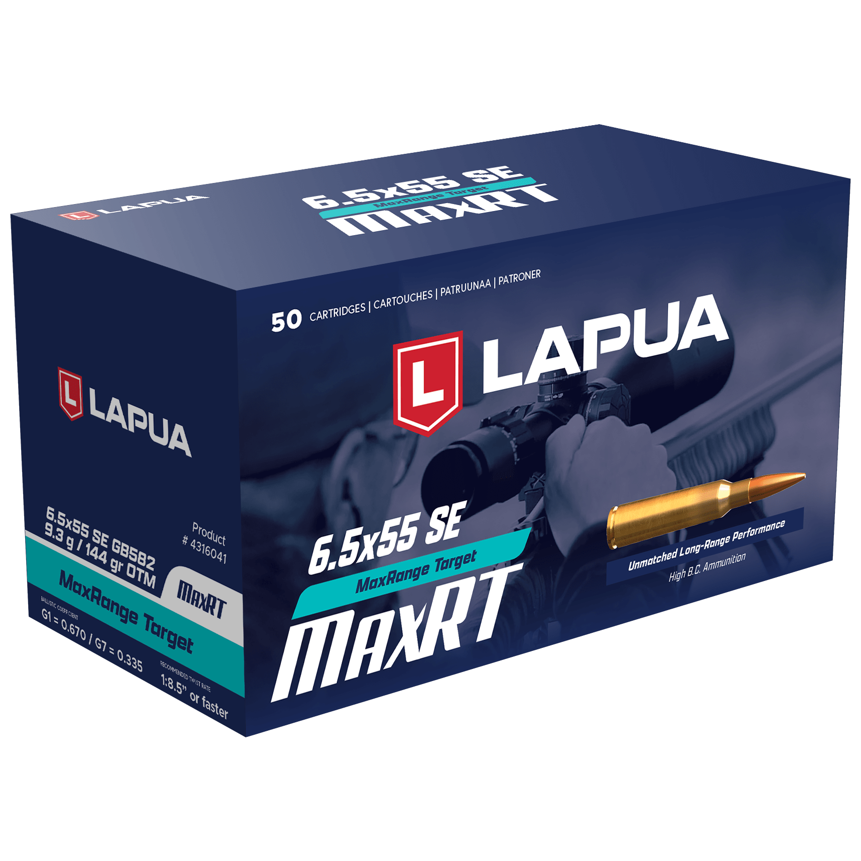 The Lapua 6.5x55 Swedish 144gr MaxRange Target OTM is a premium factory-loaded cartridge purpose-built for competitive long-range and extreme long-range (ELR) rifle shooting. Featuring the newly introduced GB582 MaxRange Target bullet, this round delivers an exceptional G7 ballistic coefficient of 0.335 and a G1 BC of 0.670, giving it a remarkably flat trajectory and outstanding wind resistance at distance. The boat-tail Open Tip Match design ensures superior in-flight stability and shot-to-shot consistency that serious competitors demand. Loaded in Lapua's legendary quality brass and optimized for bolt-action rifles chambered in 6.5x55 SE, this ammunition is an ideal choice for precision shooters pushing the boundaries of long-range accuracy.