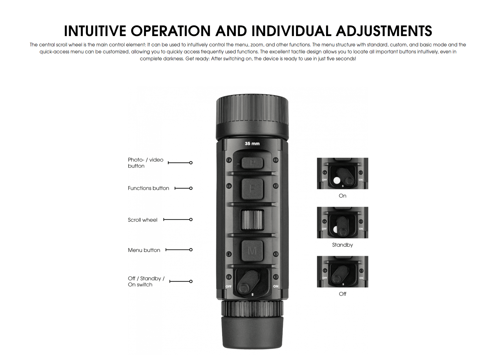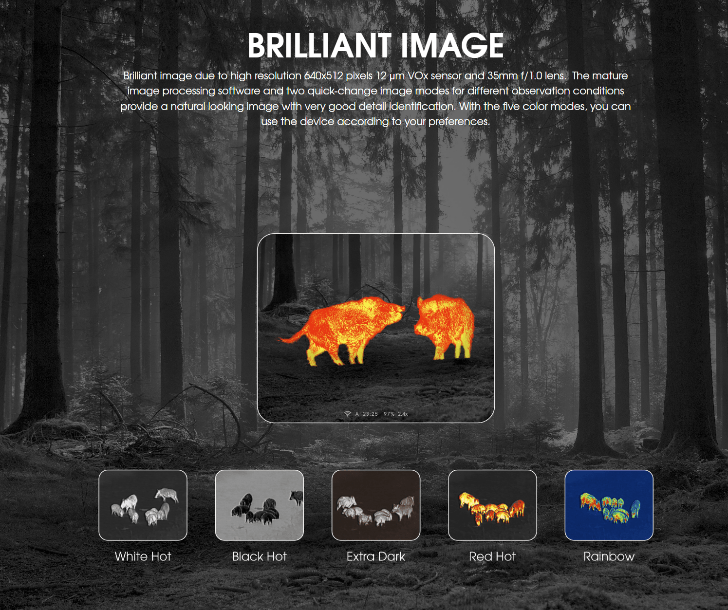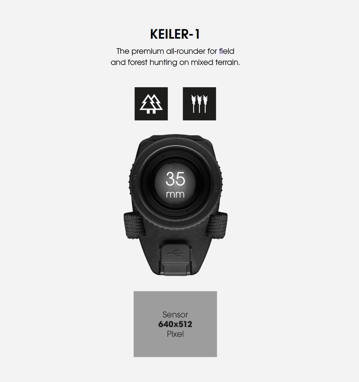 Liemke’s KEILER-1 offers maximum thermal imaging capabilities and intuitive operation. It comes equipped with a high resolution 12 µm VOx sensor with 640x512 pixels and a 35mm f/1.0 lens. This allows the KEILER-1 to pick up on heat signatures from up to 1750 meters (1913 yards) away. The advanced image processing software makes heat sources viewable in two quick change image modes, and five selectable color modes – White Hot, Black Hot, Extra Dark, Red Hot, and Rainbow – can be used to adapt the KEILER-1 to changing conditions. The long detection range and selection of different color modes makes the KEILER-1 ideal for long range observation in environments such as fields, mountains, and other conditions that involve extensive terrain.
