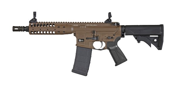 The LWRC IC-PSD 5.56mm NATO 8.5″ Patriot Brown Personal Security Detail Short Barreled Rifle (NFA) is a compact, mission-ready platform engineered for tactical performance and dependable handling in close-quarters scenarios. Chambered in 5.56 × 45 mm NATO with an 8.5-inch cold-hammer-forged barrel and a 1:7″ twist rate, it stabilizes a broad range of ammunition while the 1/2×28 muzzle threads make it ready for muzzle devices or suppressors. Built around LWRC’s patented short-stroke gas piston system, this SBR reduces heat and carbon fouling in the receiver for smooth, reliable cycling and easier maintenance. The rugged modular rail, fully ambidextrous controls, and nickel-boron coated bolt carrier add functional durability, while the Patriot Brown finish gives a distinctive, tactical look. With an adjustable compact stock, ergonomic grip, and supportive iron sights, this IC-PSD model blends maneuverability, resilience, and professional-grade performance for defense, tactical, or range applications.