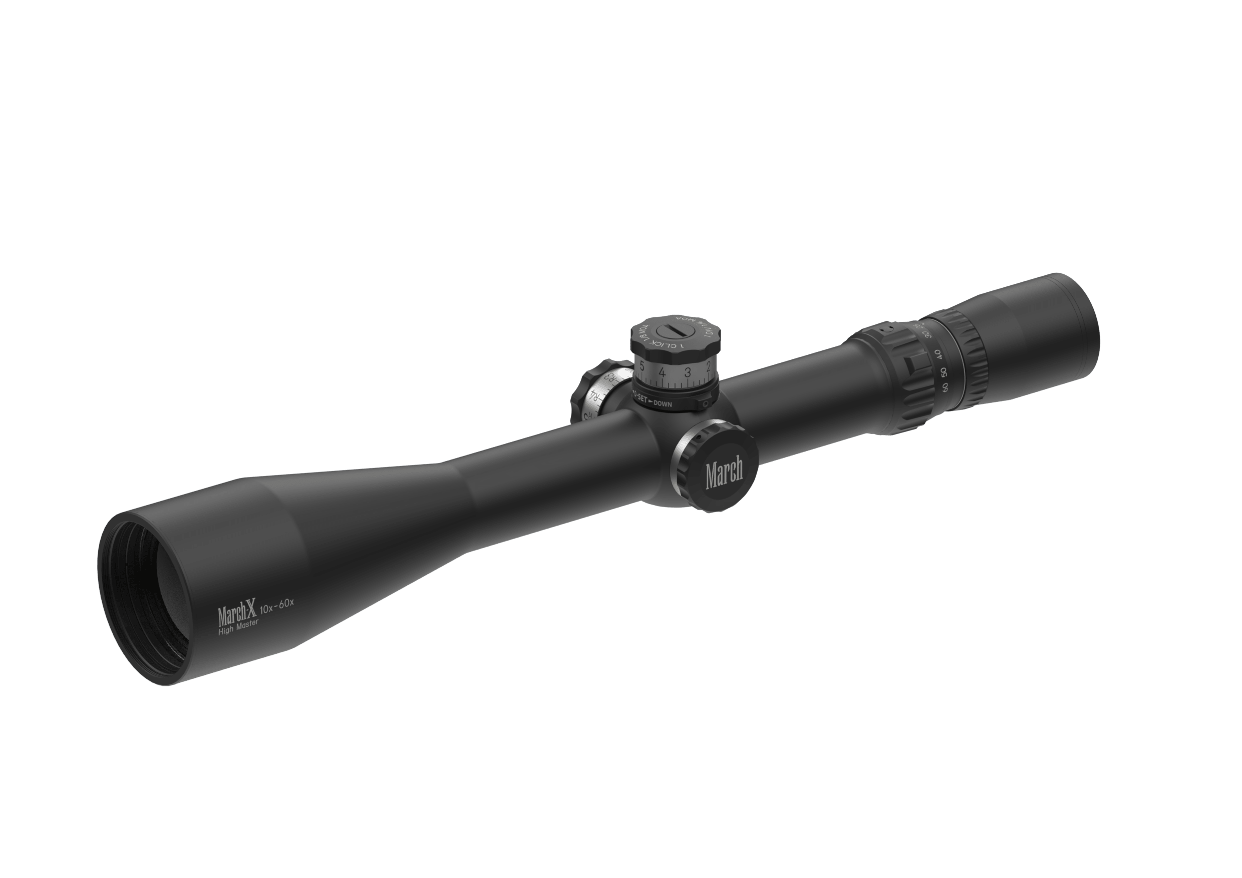 The March-X Tactical "High Master" 10-60x56mm is the pinnacle of long-range precision optics, engineered for elite competitive shooters and tactical marksmen who demand uncompromising clarity and repeatability at extreme distances. The 56mm objective lens and 95% light transmission deliver a bright, crystal-clear image across the full magnification range, while the clean, non-illuminated MTR-FT field target second focal plane reticle provides a precise, uncluttered sight picture optimized for field target competition and long-range precision shooting at every magnification setting. Innovative writable turrets allow shooters to note custom load data directly on the turret, and 1/8 MOA click adjustments ensure precise, repeatable corrections on demand. Built to the exacting standards that have made March Scopes a trusted name among the world's best long-range shooters, the High Master 10-60x56mm MTR-FT is a world-class optic that will elevate performance at every level of competition.