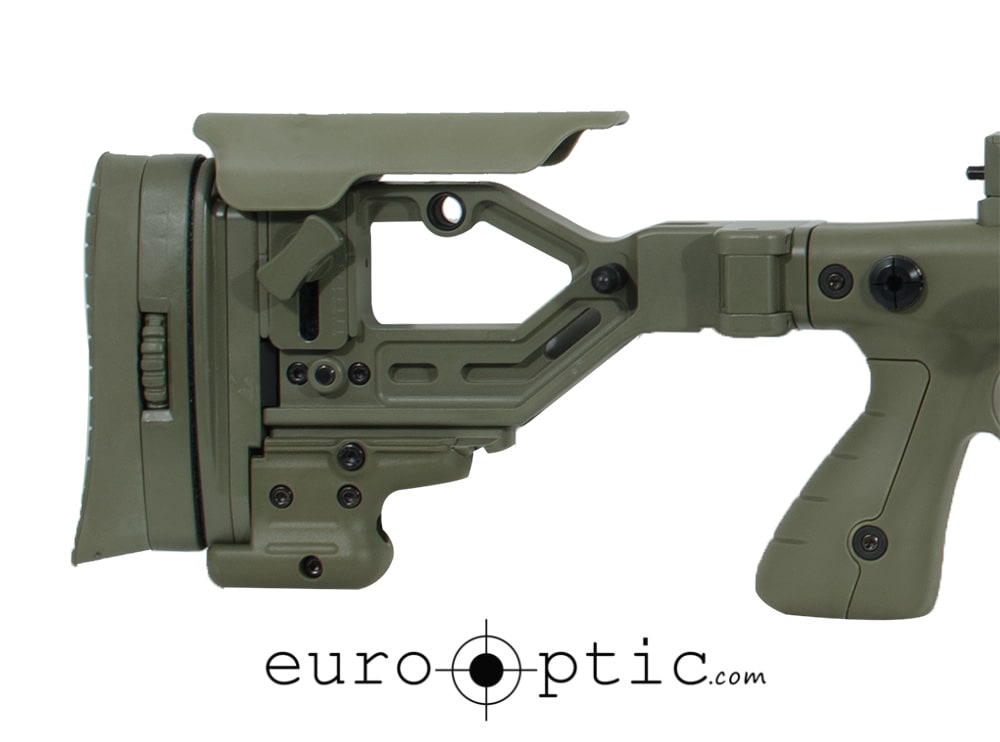 Full-length NATO STANAG 4694/Mil Std 1913 rail for accessories, optics, night vision equipment, and more. Aerospace-grade aluminum with corrosion-resistant protective coating. Rail is inclined 20MOA for .308 Win and 30MOA for magnum calibers.While the top foreend rail is full-length (and matched to the angle of the action rail), the foreend of the AX is an octagonal tube featuring AI's patented KeySlot mounting system. This foreend is easily removed with the 4mm hex wrench stored in the cheekpiece.QD flush cup sling attachments are located on the main chassis and removable/repositionable attachment points are located on rail sections attached to foreend.QuickLoc barrel release system allows for barrel removal and refit in under one minute using only the 4mm hex wrench included in cheekpiece.Chassis folding stock reduces overall rifle length by 260mm (~10").Cheekpiece is configurable for lateral and height adjustments, and also stores a 4mm hex wrench for rifle disassembly.Butt pad features a friction-locking mechanism for easy, tool-less height and angle adjustment. Rifle length of pull can be adjusted by 40mm without tools or accessories, and even more with the addition of optional 10mm or 20mm spacers (not included)Pistol grip is replaceable in minutes and can utilize different backstraps.3-position safety is based on the design of the Accuracy International Arctic Warfare (AW) battle-proven system.Two-stage trigger with adjustable shoeIncludes 10-round low-friction magazineSpecifications: