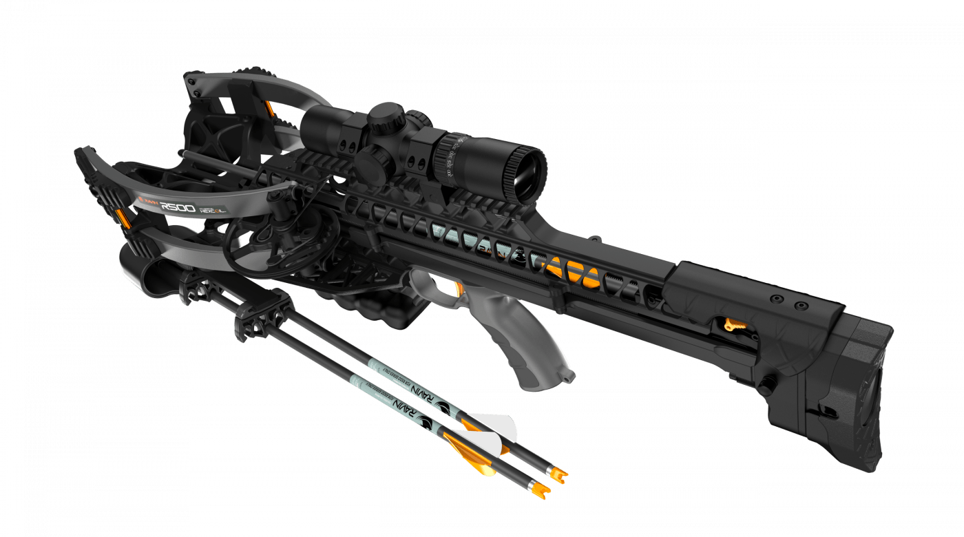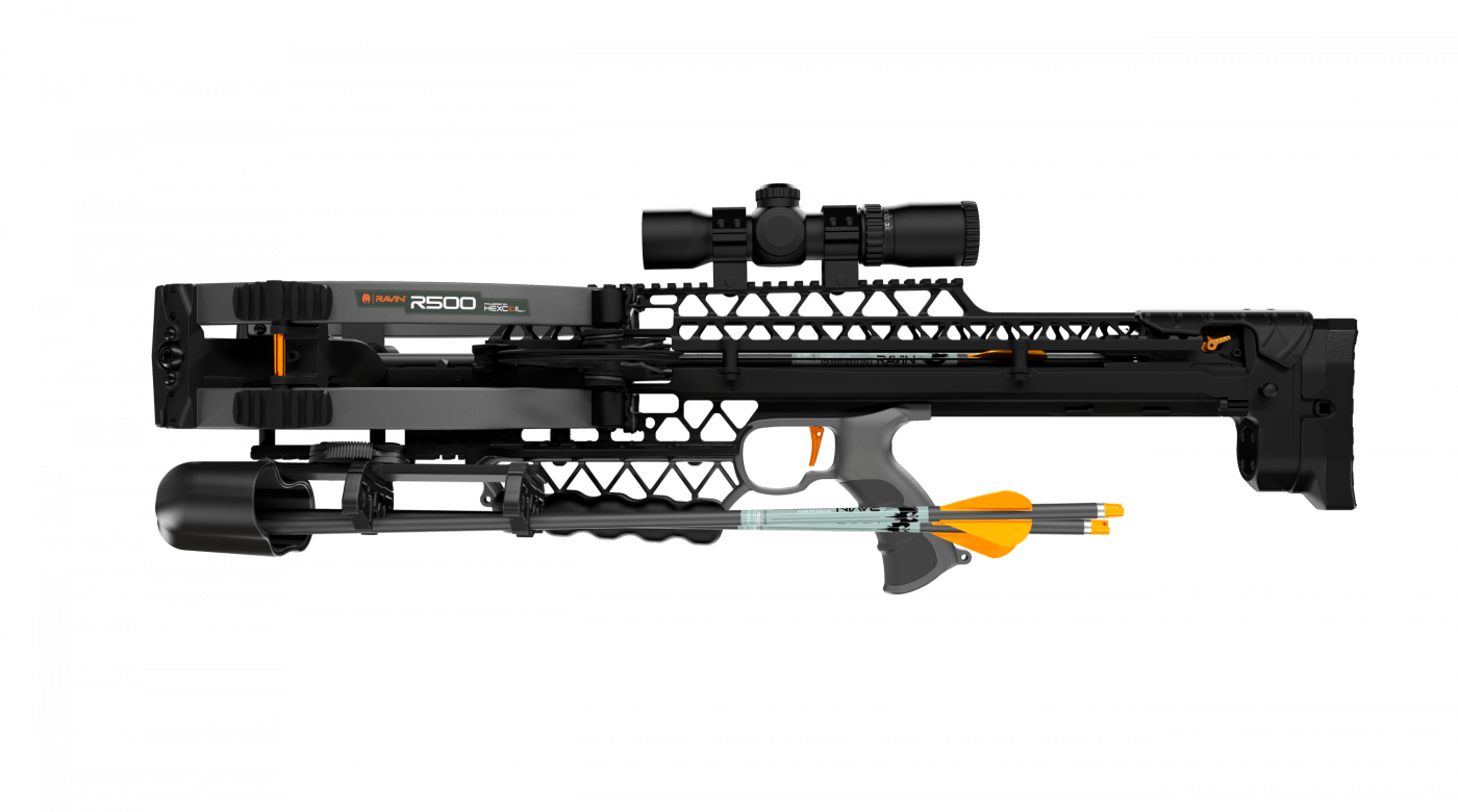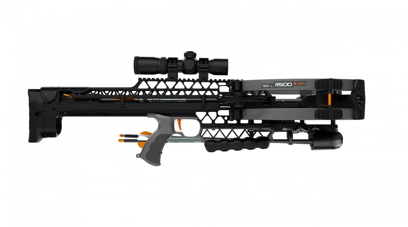 The Ravin R500 Black is a flagship powerhouse designed for extreme velocity and ultra-compact maneuverability. Utilizing the revolutionary HexCoil™ Cam System, it achieves a staggering speed of 500 FPS with 222 ft-lbs of kinetic energy while maintaining a remarkably slim 3.6-inch cocked width. This model features the VersaDrive™ Cocking System, which uses an internal screw drive and a unique internal clutch to eliminate over-cocking and allow you to safely stop or resume the cocking process at any point. The Trac-Trigger™ Firing System (TTFS) and Frictionless™ Flight System work together to ensure the arrow floats above the rail for maximum accuracy and string longevity. This package is completed with a premium 550 FPS-rated illuminated scope and three dedicated R500 series arrows, making it one of the most advanced hunting tools on the market.