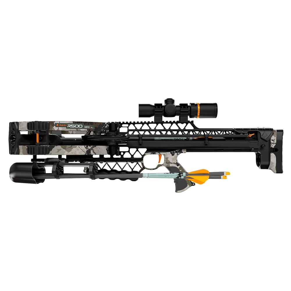 The Ravin R500 represents a major advancement in crossbow technology. It comes equipped with Ravin’s own proprietary HexCoil Cam System that turns the cams to an impressive 360 degrees for remarkably fast and accurate operation. When cocked, the axel-to-axel width is a mere 3.6 inches, and can launch a bolt at 500 feet per second. The R500 also features the VersaDrive Cocking System that uses an internal screw drive to move the Trac Trigger Firing System (TTFS) back and forth. The VersaDrive’s internal clutch eliminates the chance of over cocking and allows the whole process to be stopped at any time. In addition, the R500 can be upgraded to a R500E with the installation of Ravin’s Electric Drive Kit. This kit is composed of a motor and 12-volt battery, and allows the crossbow to be cocked or un-cocked by simply pressing a button.