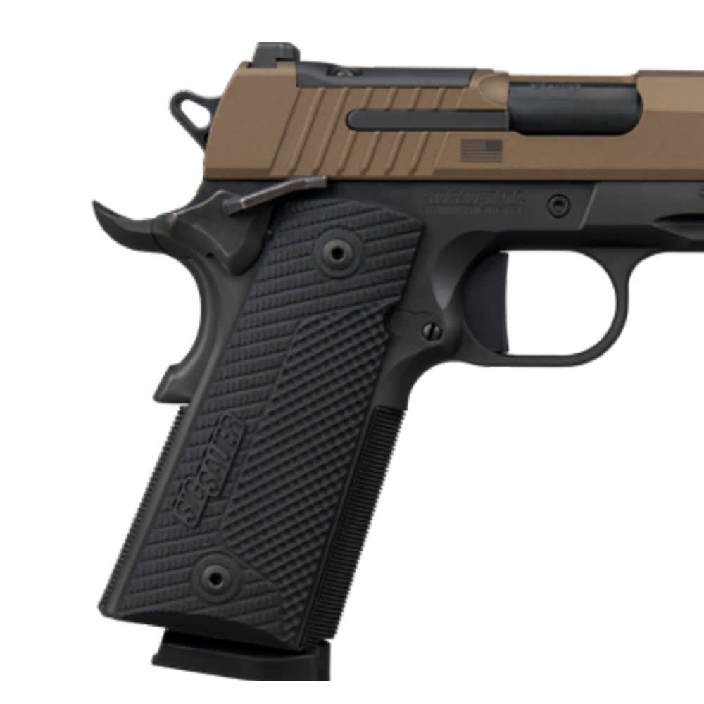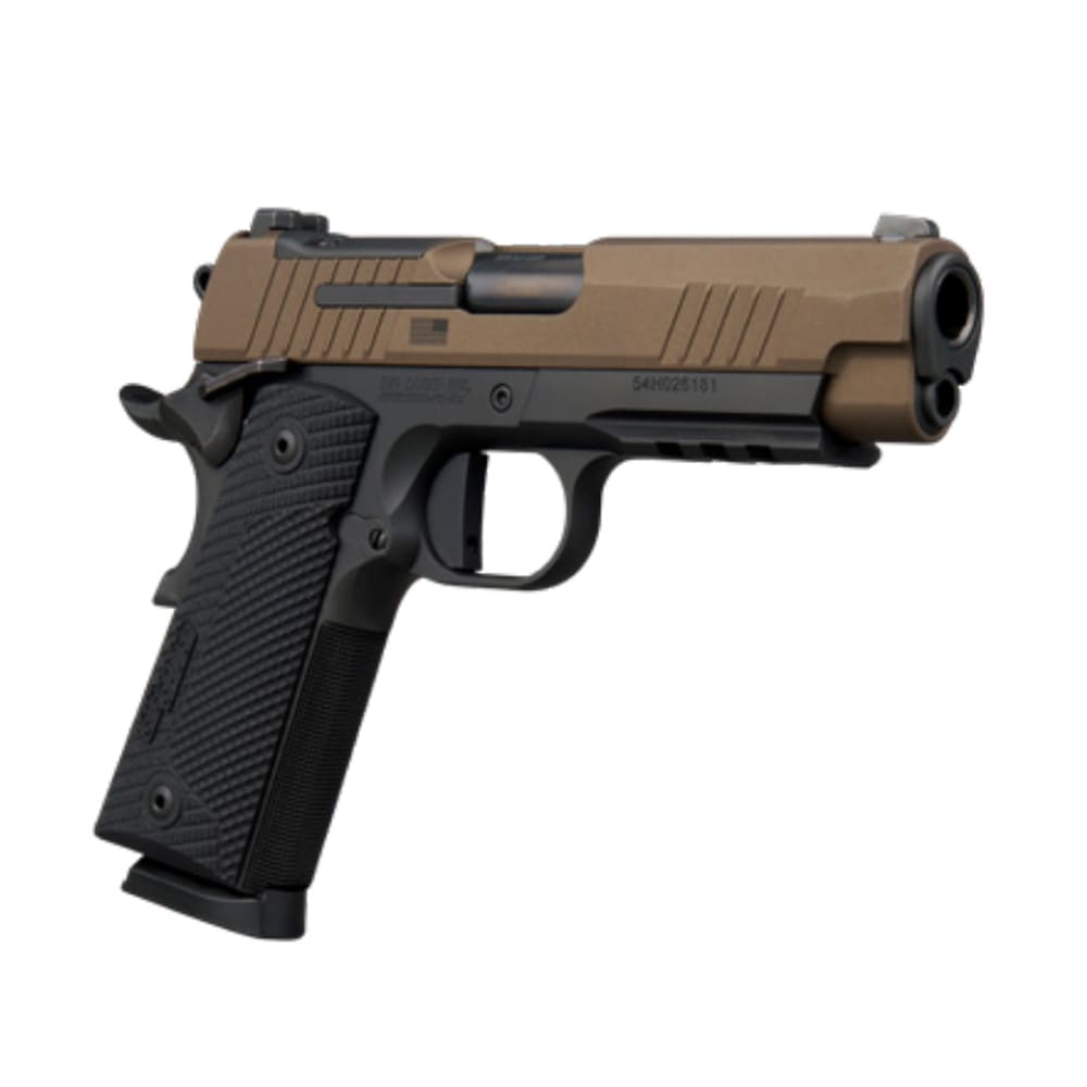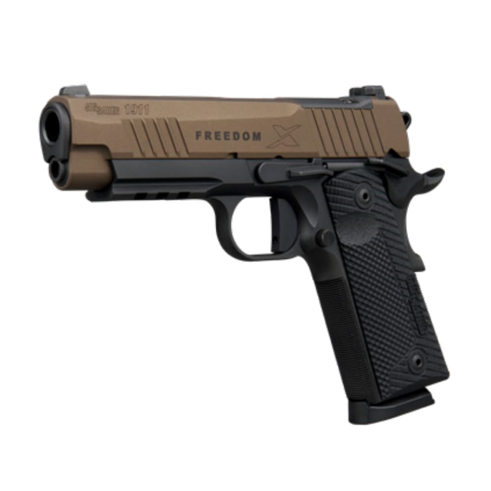 The Sig Sauer 1911 X-Series LE Freedom is a modernized, carry-sized 1911 chambered in .45 ACP that blends traditional aesthetics with contemporary performance features. This limited-edition pistol features a 4.2-inch barrel and a distinctive two-tone bronze and black finish, complemented by custom LOK Grips G10 grip panels for superior handling. It is designed with a single-action-only (SAO) flat-blade trigger for a crisp, predictable break, and an undercut trigger guard to allow for a higher, more controlled grip. A standout feature is the optic-ready stainless steel slide with a compact footprint, allowing for the direct mounting of red-dot sights like the SIG Sauer Romeo-X. Standard equipment includes high-visibility X-RAY3 Day/Night sights, an ambidextrous manual safety, and an M1913 accessory rail for lights or lasers. Each unit ships with two 8-round steel magazines and represents a collaborative effort with Turning Point USA, supporting the organization through a donation from each sale.