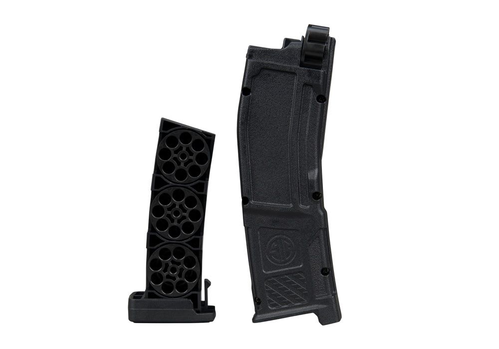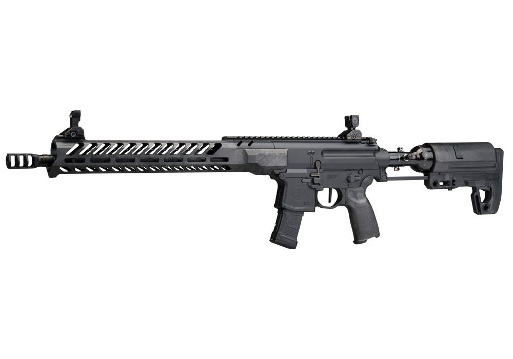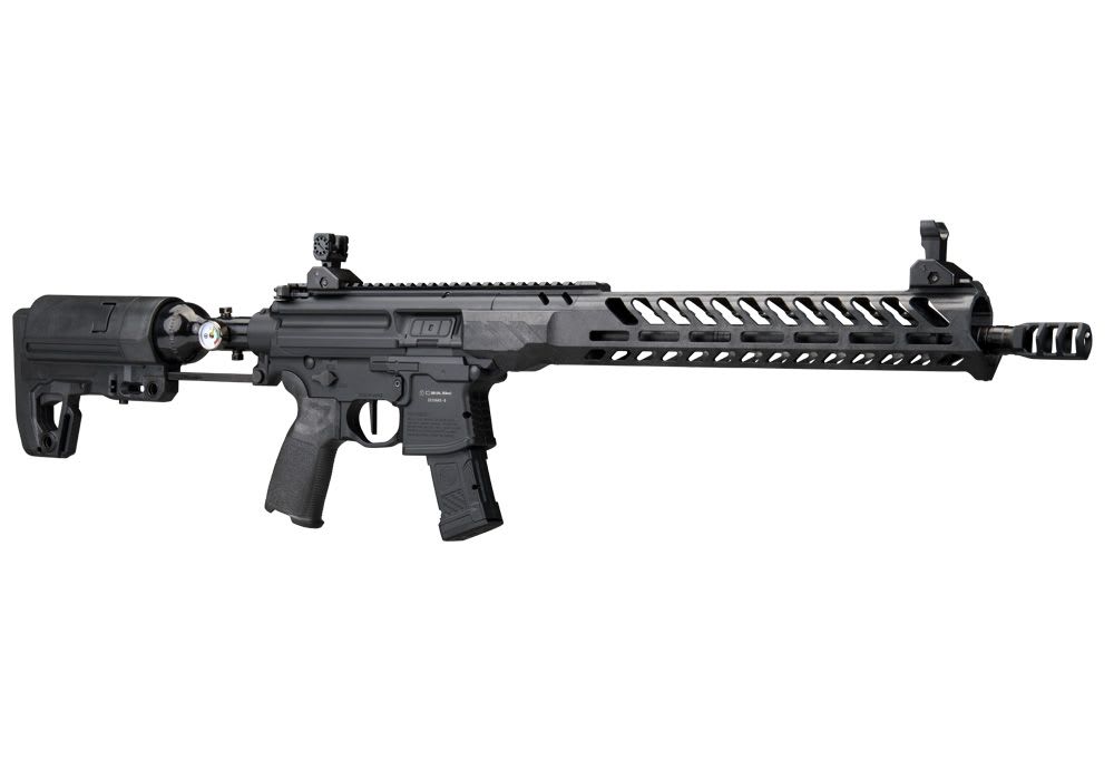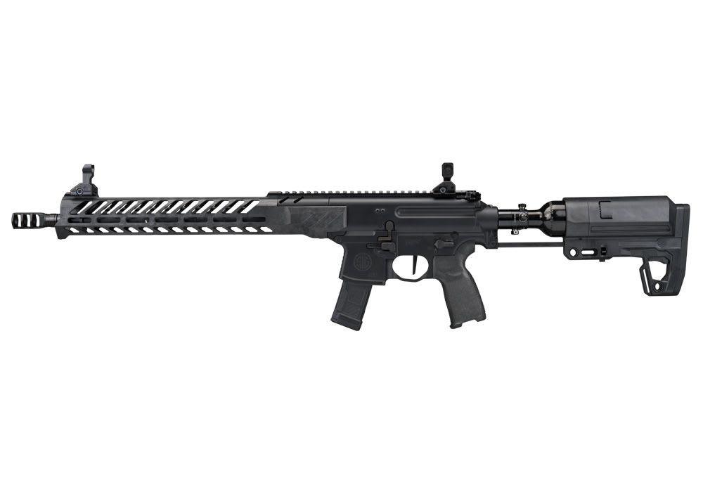 The Sig Sauer MPX PCC .22 Caliber PCP Air Rifle is a semi-automatic, pre-charged pneumatic (PCP) airgun designed to replicate the look and feel of its centerfire pistol caliber carbine counterpart. It features a 13-cubic-inch (213 cc) regulated air cylinder that fills to 3,000 psi and delivers a consistent 1,100 psi output, producing over 100 shots per fill. Chambered for .22 caliber pellets, this black air rifle achieves muzzle velocities up to 700 FPS and utilizes an auto-advancing magazine system that holds an 8-round cylinder, with storage in the magazine for 3 additional spare cylinders. Constructed with a full metal receiver and polymer furniture, it comes equipped with a reduced-angle pistol grip compatible with standard AR-15 grips, an M-LOK handguard, flip-up front and rear sights, and a quick-detach adjustable buttstock for easy access to the air cylinder.