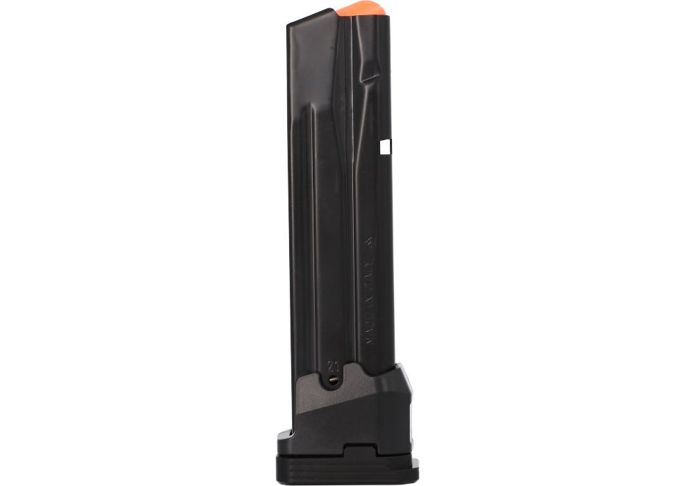 The Sig Sauer P320 23-round Extended Magazine is a premium factory-grade component designed to provide maximum firepower and mission-critical reliability for the P320 Full-Size, Carry, and M17/M18 platforms. Constructed from rugged carbon steel with a corrosion-resistant finish, this extended magazine features a high-visibility follower and a heavy-duty spring to ensure consistent, jam-free feeding during high-volume strings of fire. The integrated witness holes along the rear of the body allow for an instant round-count assessment, while the impact-resistant polymer base pad provides a secure grip for rapid reloads and extra protection against drops. Engineered to the exact tolerances of the Sig Sauer P320 series, this 23-round magazine is the ideal choice for competitive shooters, tactical professionals, and home defense enthusiasts who require a high-capacity advantage without compromising the functional integrity of their 9mm firearm.