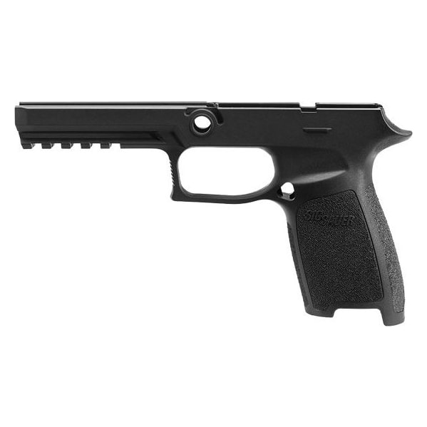 This Sig Sauer P320 Full Size Small Grip Module is a genuine factory replacement part finished in a standard black polymer. It is designed to house P320 or P250 Fire Control Units in 9mm, .40 S & W, or .357 SIG that do not require a manual safety cutout. The "Full Size" length features a full-length rail for 4.7-inch slides and a full-size grip for maximum magazine capacity, while the "Small" circumference offers a slimmer profile for shooters with smaller hands. This assembly comes ready for immediate installation and includes a pre-installed, reversible magazine catch.