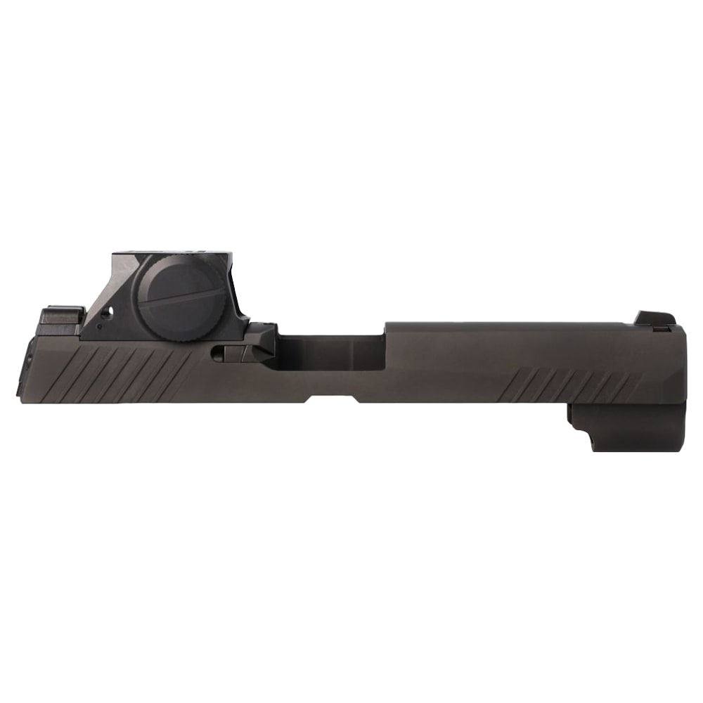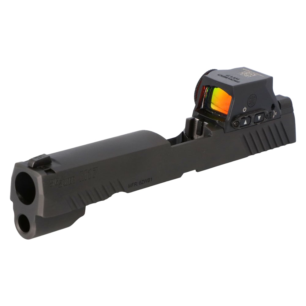 The SIG Sauer P320‑M17 4.7″ Slide Assembly is a factory‑built, optics‑ready M17 slide finished in black and equipped with SIG’s ROMEO‑M17 reflex sight and SIGLITE iron sights for immediate, low‑deck red‑dot performance. Built from stainless steel and advertised at ≈13.8 oz, the 4.7″ M17 slide accepts standard 4.7″ 9mm P320 barrels and features the SIG‑LOC (M17/M18) optic footprint and a loaded‑chamber indicator for enhanced safety awareness. Sold as a slide assembly (barrel and recoil components are typically not included), it’s an ideal, drop‑in factory option for converting a compatible P320 fire control unit to the M17 configuration without aftermarket fitting.