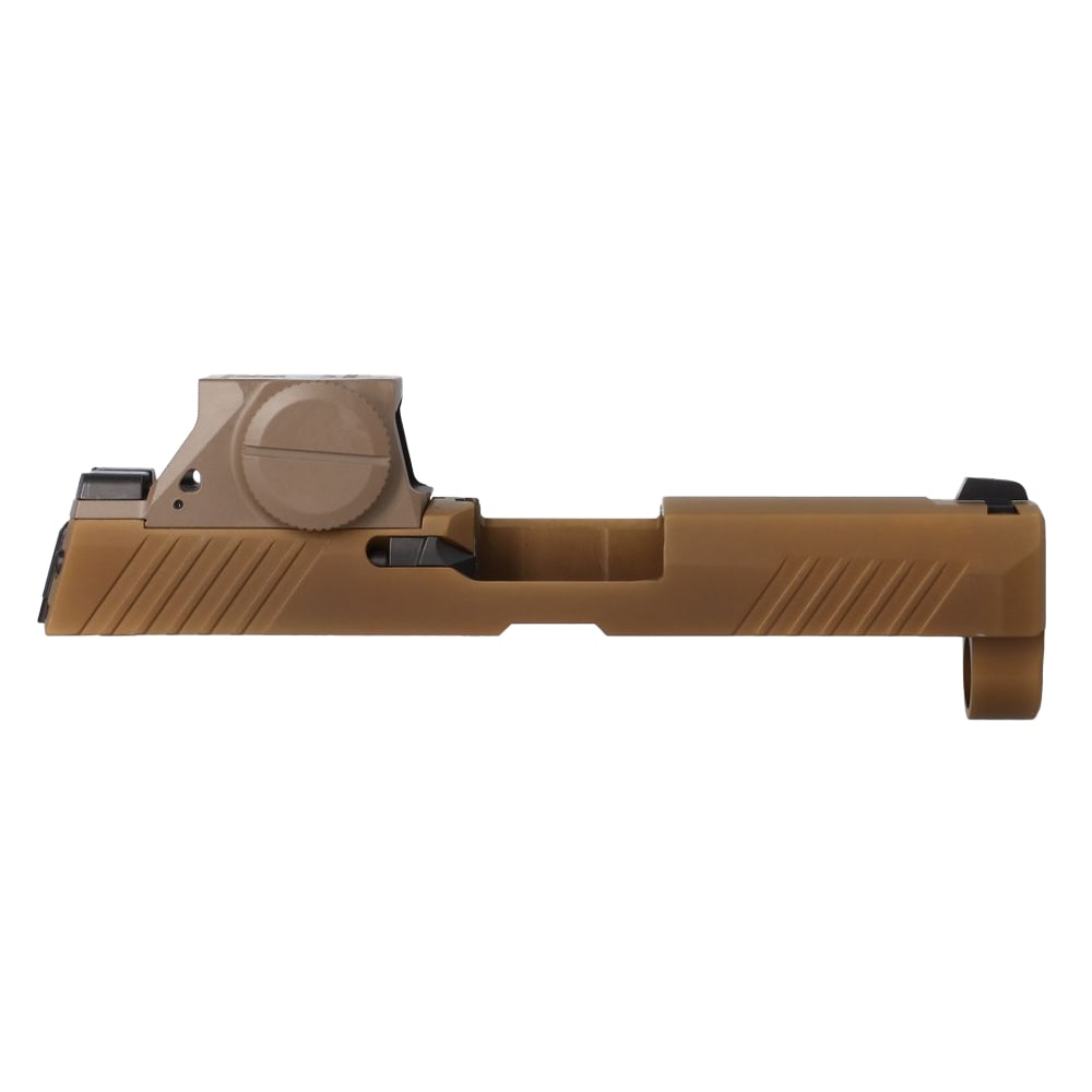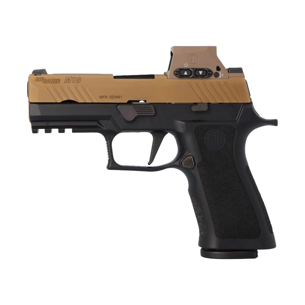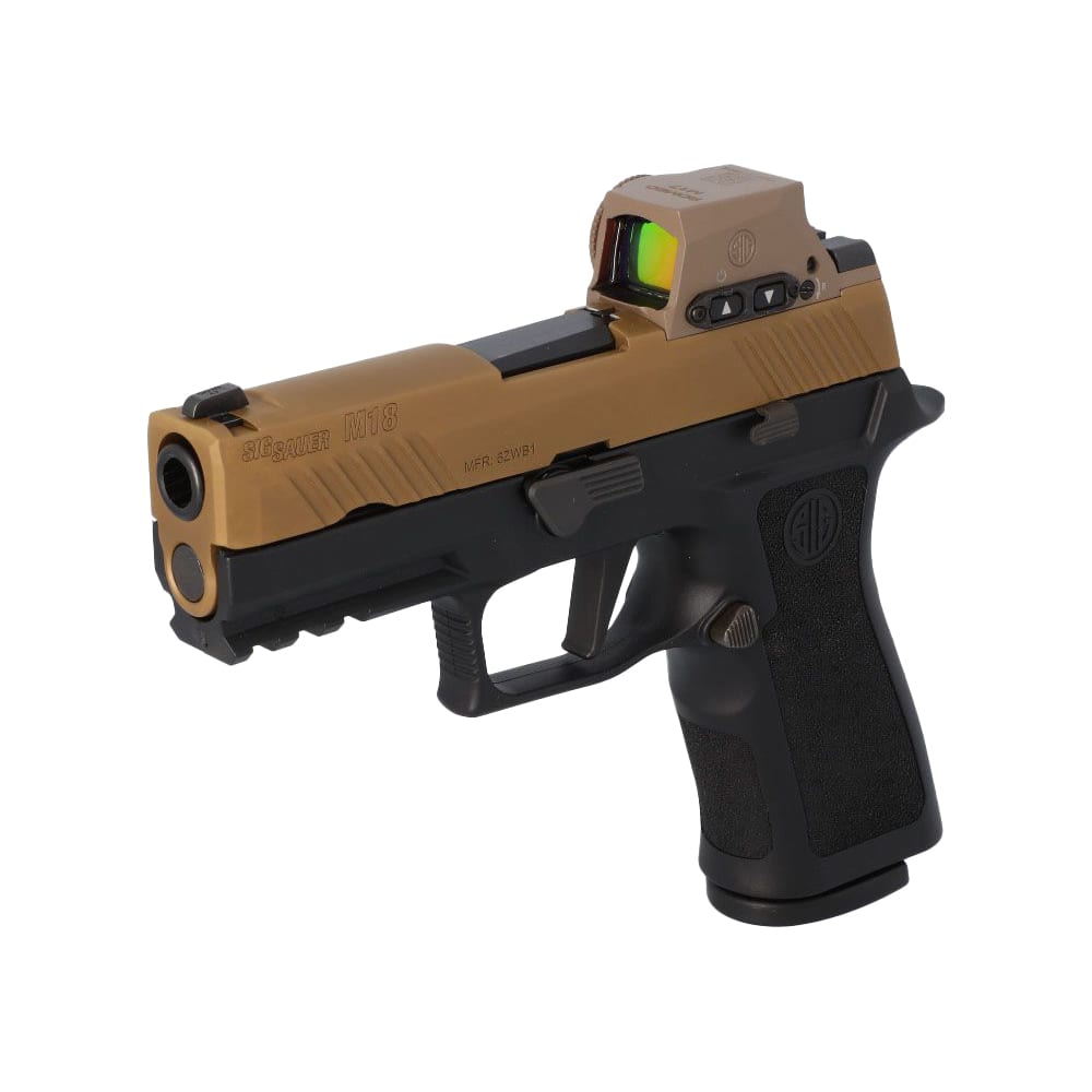 The SIG Sauer P320 M18 Slide Assembly is a factory‑built, optics‑ready M18 slide finished in coyote PVD and fitted with SIG’s ROMEO‑M17 reflex sight and SIGLITE sights — a turnkey way to convert or refresh a compatible P320 fire‑control unit into an M18 configuration. Built from stainless steel and listed at 12.4 oz, this 3.9″ 9mm slide assembly includes the loaded‑chamber indicator and the factory‑mounted ROMEO‑M17 for out‑of‑the‑box sighting performance, making it ideal for users who want a military‑style M18 appearance and a pre‑installed optic without having to mill or fit parts themselves. Note: verify the retailer listing for whether the barrel and recoil components are included with the assembly before purchasing — some listings sell the slide assembly alone.