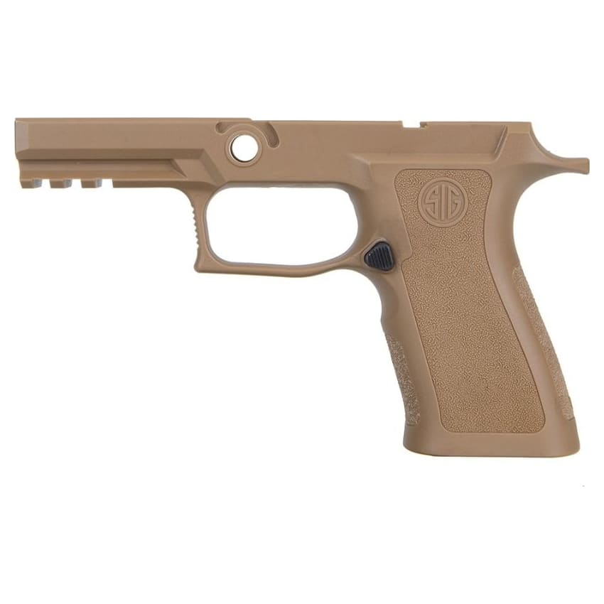 This Sig Sauer P320 X-Series Carry Grip Module is a premium factory upgrade finished in a durable coyote tan polymer for Fire Control Units without a manual safety. It features the signature X-Series ergonomics, including a deep trigger guard undercut and an extended beavertail, which allow for a higher grip and improved recoil management. The "Small" circumference "Carry" length frame provides a slimmer profile for easier trigger reach while maintaining a full-size grip for increased magazine capacity and a compact-length rail for 3.9-inch slides. This assembly comes ready for installation with a pre-installed, reversible magazine catch and is compatible with internal tungsten weights for added balance.