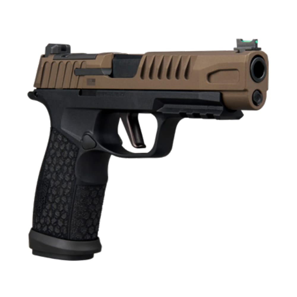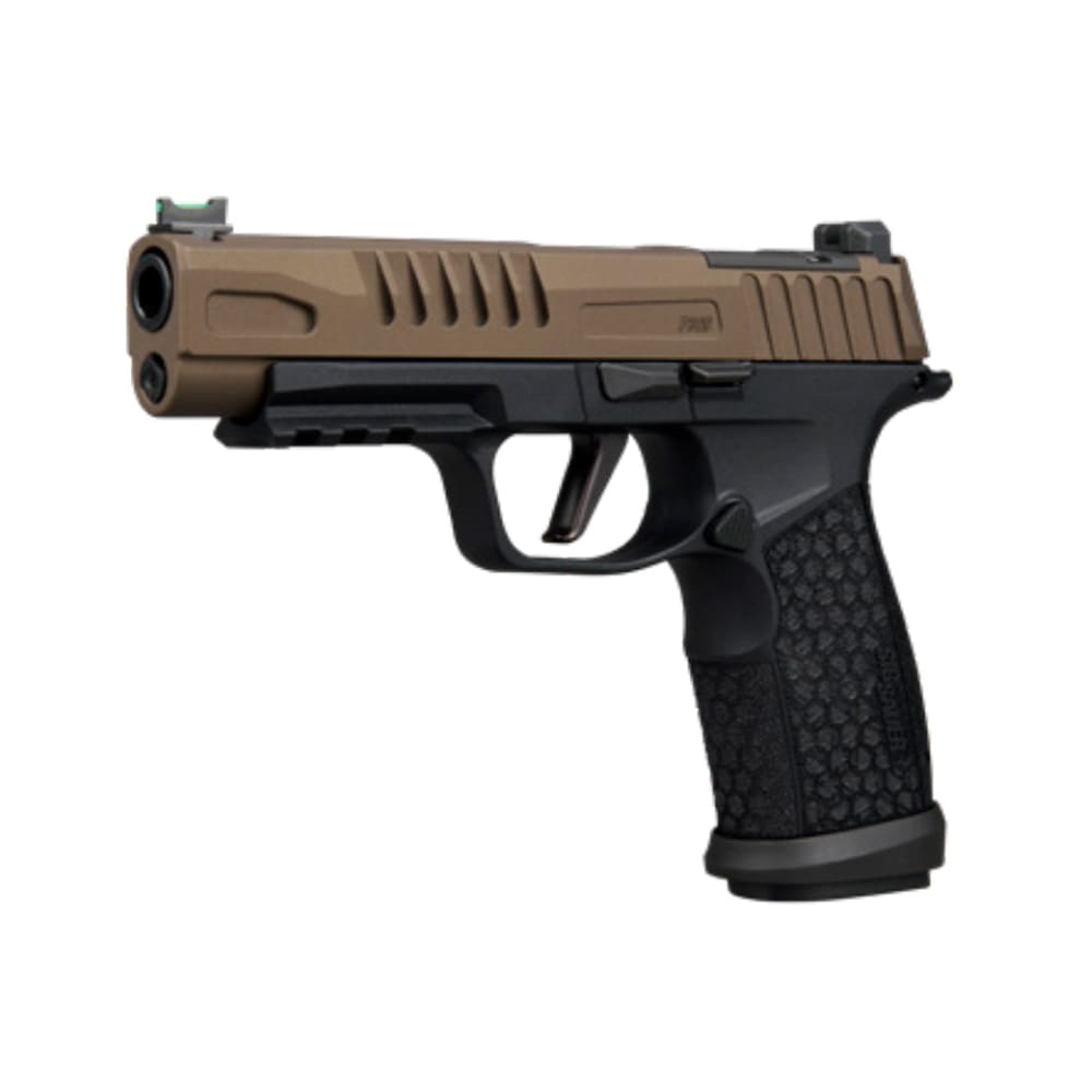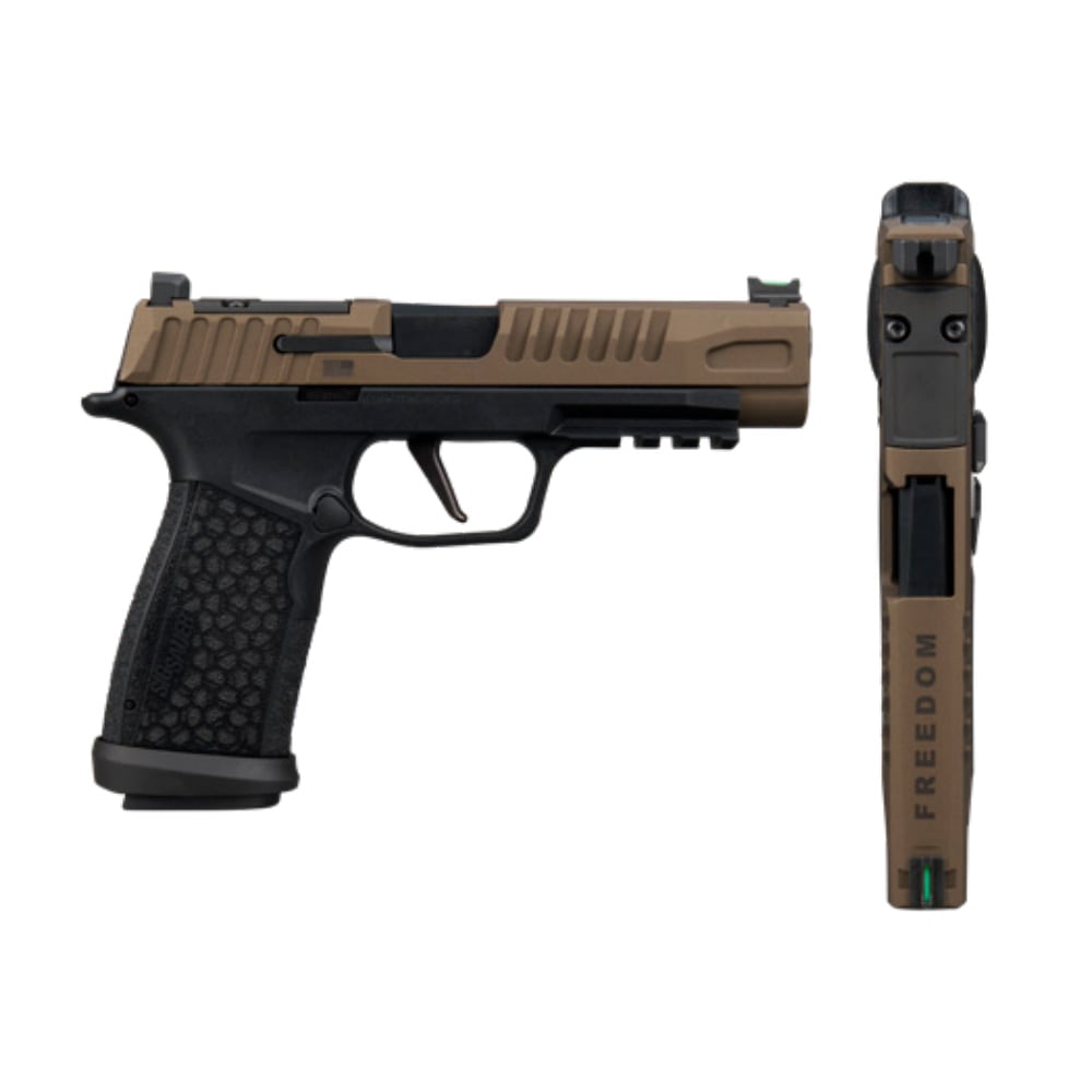 The Sig Sauer P365 FUSE Freedom is a high-capacity, full-size crossover pistol that marks the longest iteration of the P365 series to date. This 9mm striker-fired handgun features a 4.3-inch carbon steel barrel with a DLC finish, offering a longer sight radius and increased muzzle velocity compared to its predecessors. Its aesthetic is distinguished by a bronze-finished stainless steel slide with custom "Freedom" and American flag engravings, paired with a black polymer LXG (Laser Engraved X-Grip) module that provides an aggressive, stippled texture. The optic-ready slide is designed with a compact Shield RMSc footprint for direct mounting of red dots and comes standard with a high-visibility fiber-optic front sight and a serrated black rear sight. For maximum versatility, the pistol includes a removable flared magwell, an M1913 accessory rail, and three interchangeable backstraps to customize the 1-inch slim grip. This limited-edition package ships with two 21-round extended magazines and one 17-round flush-fit magazine, delivering duty-sized capacity in a concealable profile.