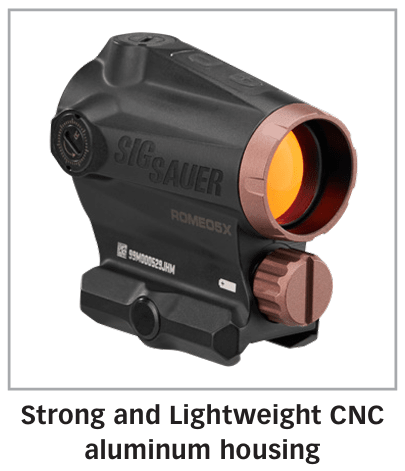 The Sig Sauer ROMEO5 1×20mm Red Dot Sight is a compact, durable optic engineered for rapid target acquisition and dependable performance across a wide range of shooting applications. Featuring a crisp 2 MOA dot paired with a 65 MOA circle reticle, this optic allows shooters to quickly engage close-range targets while maintaining precise aiming capability. Sig Sauer’s motion activated illumination technology helps extend battery life by automatically powering the optic on when movement is detected and off when idle, delivering up to 50,000 hours of runtime from a single AAA battery. Built with rugged construction, anti-reflective and scratch-resistant lens coatings, and an IPX-7 waterproof rating, this red dot sight is designed to withstand harsh environmental conditions while maintaining consistent performance.