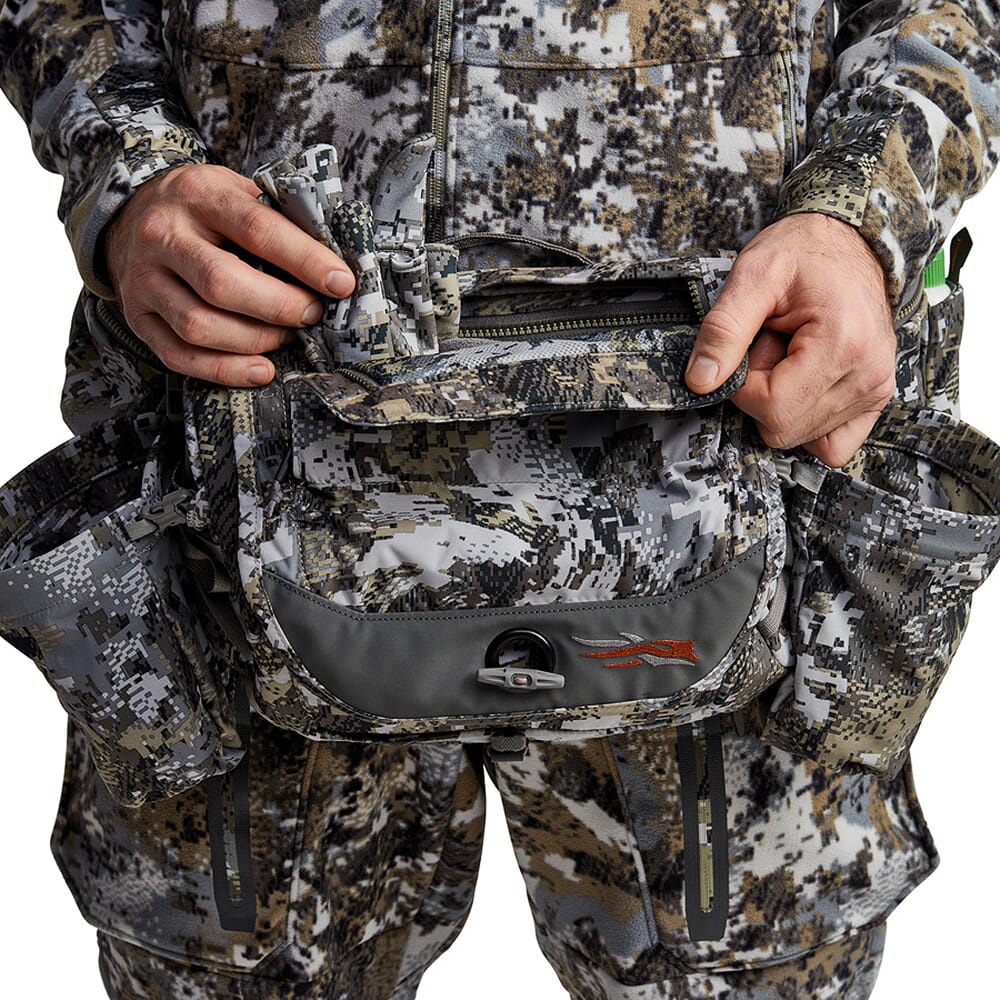 The Sitka Gear Tool Belt is a must-have for minimalist hunters. Its efficient low-profile design, along with the removable Sitka Gear jacket and bib shoulder harness system, ensures you have all the essentials you need in the field. This hip pack features convenient two-way top lid access with a magnetic closure, a bucket-style design, and a Gore ™ Optifade™ Elevated II Mesh Viewing Window. It also offers practical features like two removable water bottle holders, YKK® Vislon® zip storage pockets on the hips, a wind indicator pocket, and a stowable/removable shoulder harness with an apparel stuff pouch. With breathable air-mesh back panels, a bow-arm storage pocket, accessory and antler straps, a durable water-repellent finish, and 600 cubic inches of storage, the Sitka Gear Tool Belt is designed to meet the needs of serious hunters who prefer to keep things streamlined and efficient.